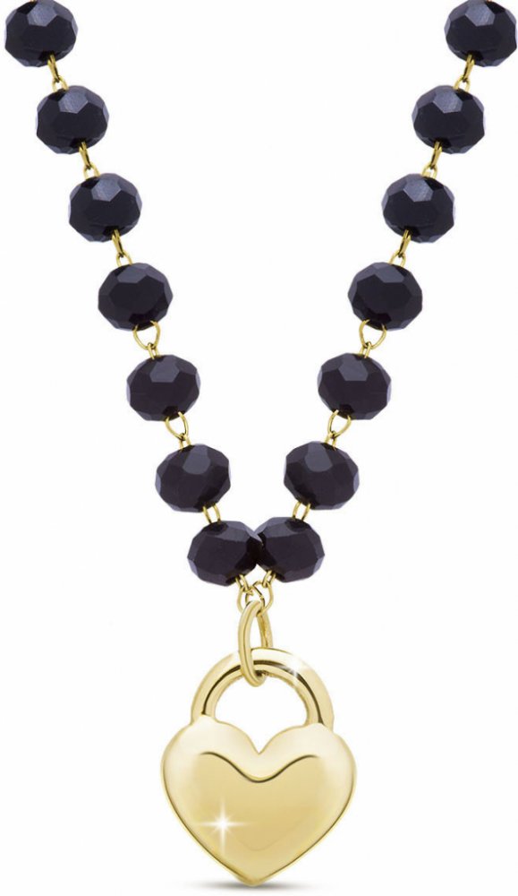 Biju Korále černé spojené pozlacenými 14k očky a srdíčkem, 3002285
