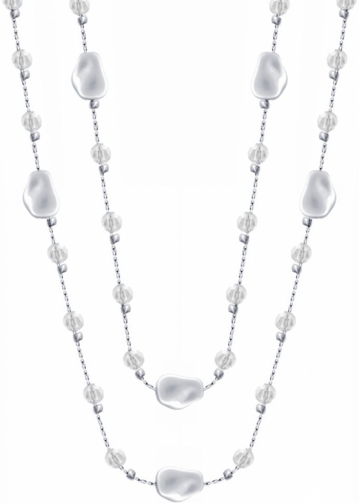Vzdušný a sofistikovaný dlouhý náhrdelník ve stříbrném tónu spojuje jemný řetízek, čiré broušené korálky a matné stříbrné komponenty nepravidelných tvarů. Tento doplněk působí étericky a čistě – ideální pro slavnostní příležitosti, svatby i romantické večery.