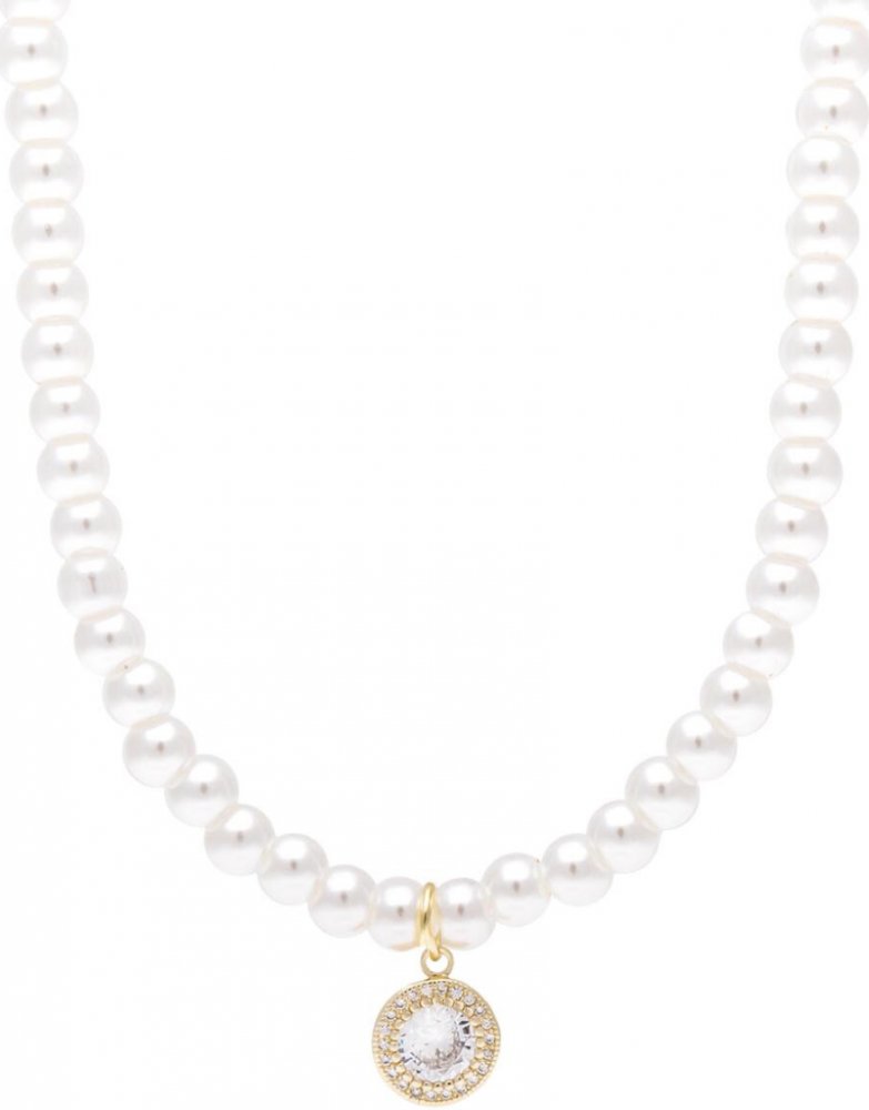 Elegantní náhrdelník tvořený řadou jemných bílých perliček zdobí pozlacený přívěsek z bižuterního kovu. Na výběr jsou dvě varianty – třpytivý čtyřlístek osázený drobnými kamínky nebo kulatý přívěsek se zářivým středovým krystalem. Tento šperk je ideálním doplňkem pro slavnostní chvíle i každodenní nošení, kdy dodá outfitu nádech luxusu a ženskosti.