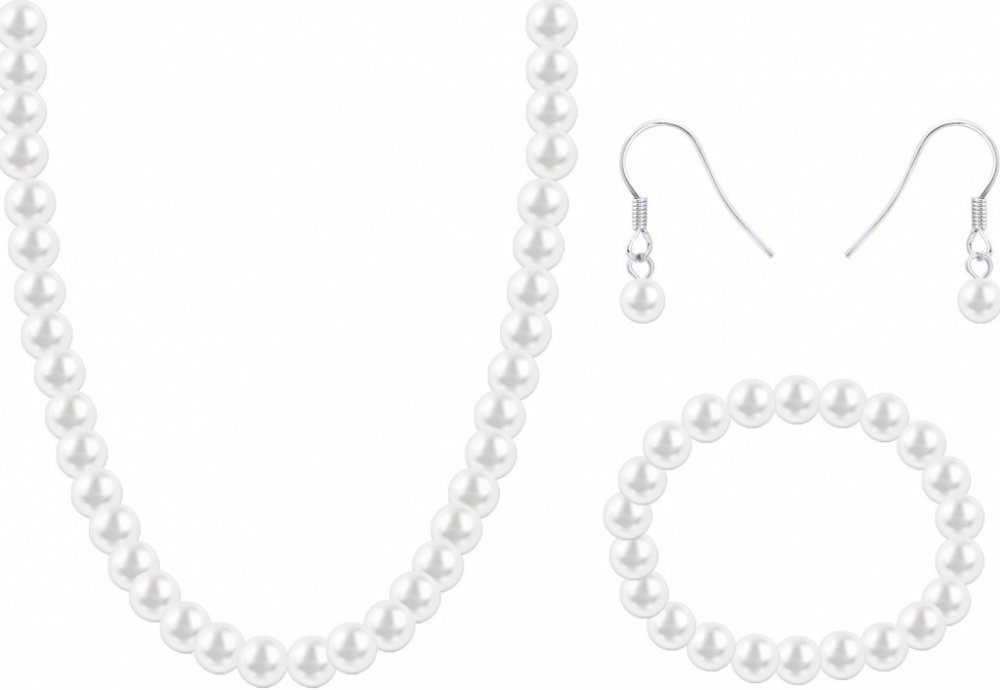 Výrazný a velice elegantní set z bižuterního kovu zdobený umělými bílými perličkami. Set obsahuje náhrdelník, náušnice a náramek.