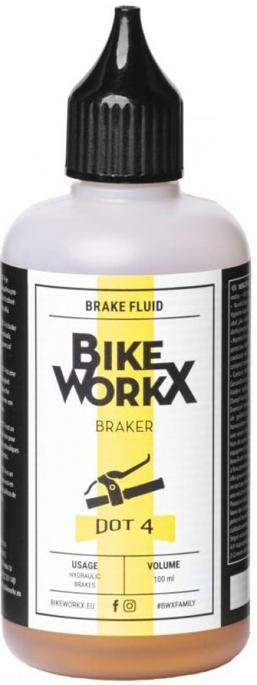 Popis produktu Vysoce účinná brzdová kapalina určená pro všechny hydraulické brzdové systémy s brzdovou kapalinou DOT 4. BikeWorkx si zakládá na nejvyšší kvalitě svých produktů, proto i Braker DOT 4 prošla rozsáhlým testováním a vývojem, aby splňovala nároky i profesionálních závodníků. Díky speciálnímu složení zaručuje vysoký bod varu, žádné vadnutí brzd a maximální brzdný výkon i za měnících se podmínek.