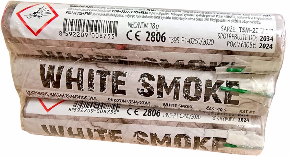 Pyrotechnika bílá dýmovnice WHITE SMOKE 3ksBílý hustý dýmPrůměr: 27 mmDélka: 140 mmČas: cca 40sPoček kusů v balení: 3Balení v kartonu: 48/3Třída nebezpečí: P1ADR zařatení: 1.4GBezpečnostní pokyny: Jen pro venkovní použití! Položte jednotlivě na zem, zapalte konec zápalnice a vzdalte se do bezpečné vzdálenosti alespoň 15m. Sledujte směr kouře, nevdechujte dým! Vždy postupujte podle návodu na balen...