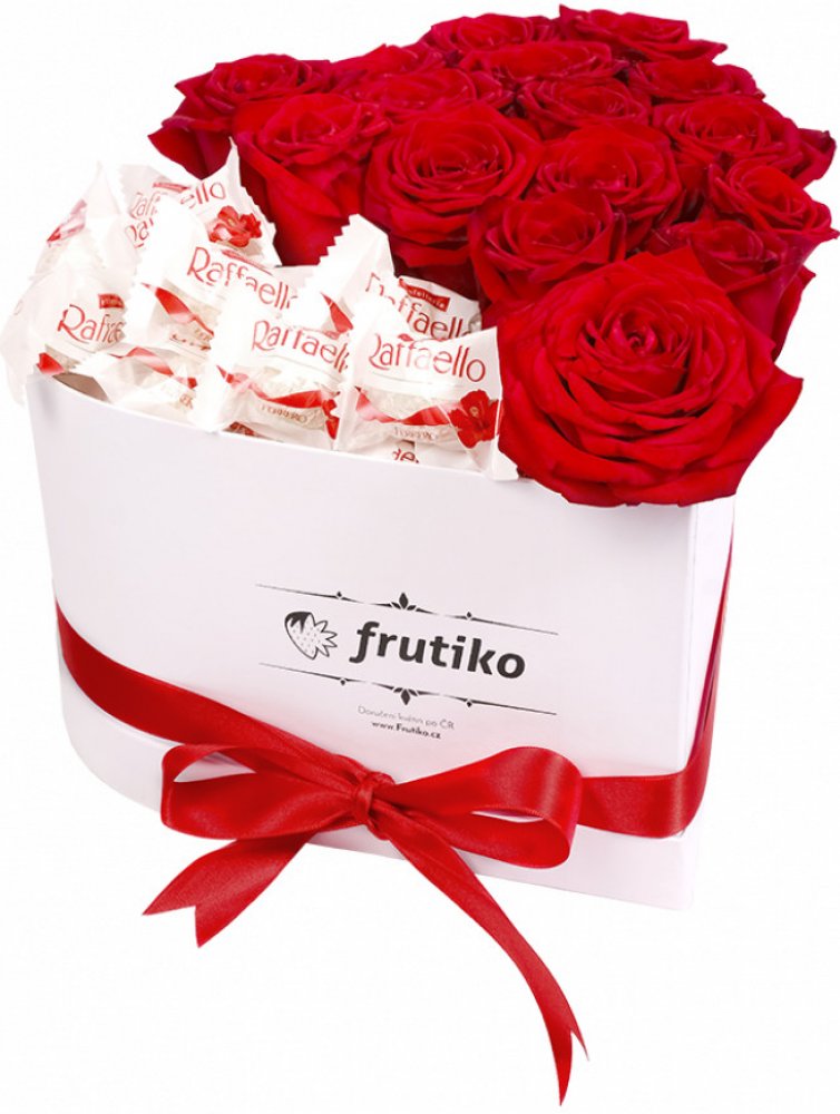 Bílá krabice ve tvaru srdce s rudými růžemi Raffaello.