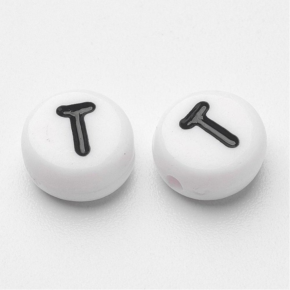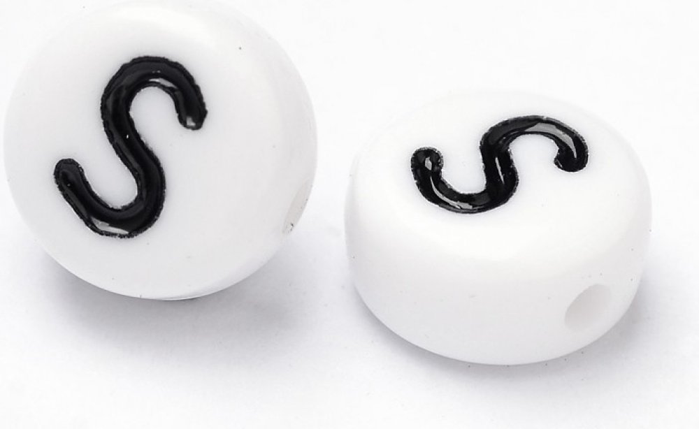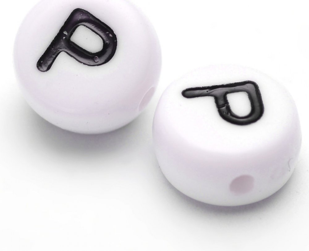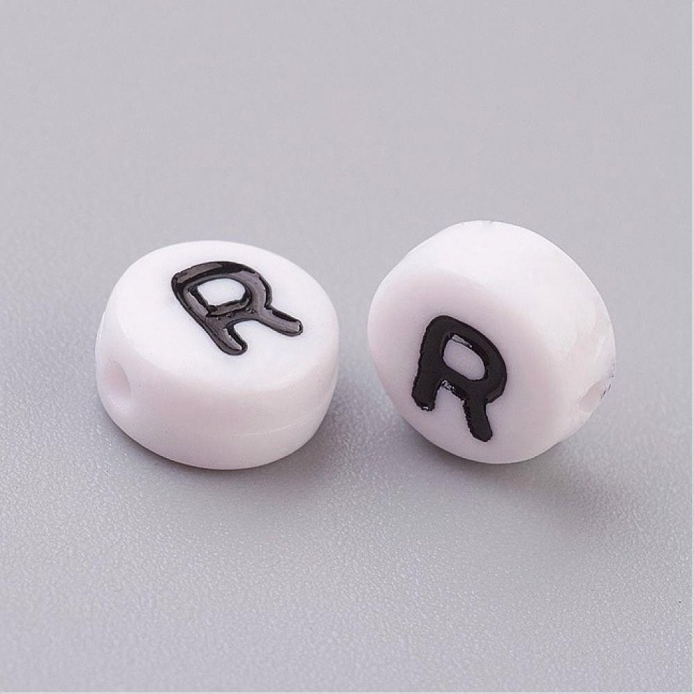 Plastové korálky s písmenky, bílé s černými písmeny.