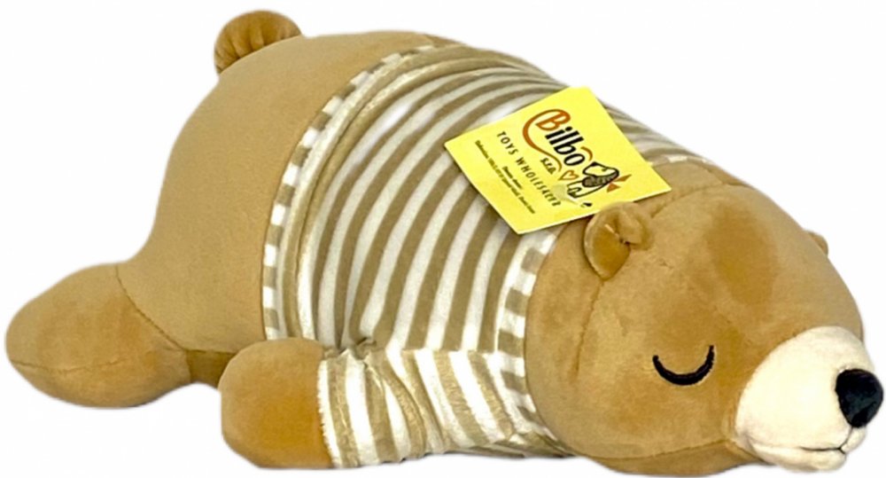Medvídek má roztomile zavřené oči, což mu dodává klidný a relaxační výraz. Je oblečený do pruhovaného trička v jemných přírodních tónech, které podtrhuje jeho útulný vzhled. Díky svému podlouhlému tvaru je perfektní nejen jako plyšová hračka, ale i jako polštář na spaní nebo cestování.