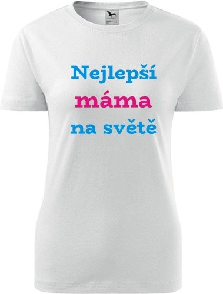 Bílé dámské tričko nejlepší máma na světě. nabízené velikosti jsou S,M,L,XL,XXL. Výběr z 12ti barev. Tričko patří do kategorií Dárek pro maminku, Dárek pro ženu k 31, Dárek pro ženu k 34, Dárek pro ženu k 45, Dárek pro ženu k 69,. Technologie potisku: Tisk na tričko je realizován pomocí termolisu a potisk je velice trvanlivý.