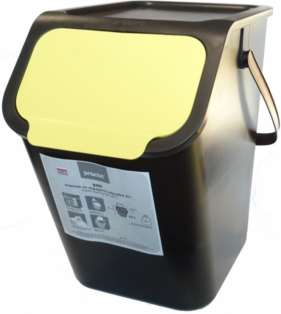 Kvalitní pevný plastový odpadkový koš lze používat samostatně, nebo při zakoupení více kusů jako koše na tříděný odpad (nabízíme v různých barevných variantách). Využijete nejen v kuchyni, ale i v garáži či v dílně. Koš je možno stohovat a tím šetřit místo. Disponuje praktickým sklopným uchem k usnadnění přenášení. Víko je vybaveno dvěma způsoby otevírání - odklopením menšího barevného poklopu pro rychlé vložení odpadu a odklopením celého víka pro objemnější odpad a snadnější následnou manipulaci. Barevný poklop je uvnitř opatřen přihrádkou pro vložení filtru pro zachycení pachů (filtr není součástí). Materiál: plast Rozměry: 37,5 x 25 x 38 cm Objem: 25 l