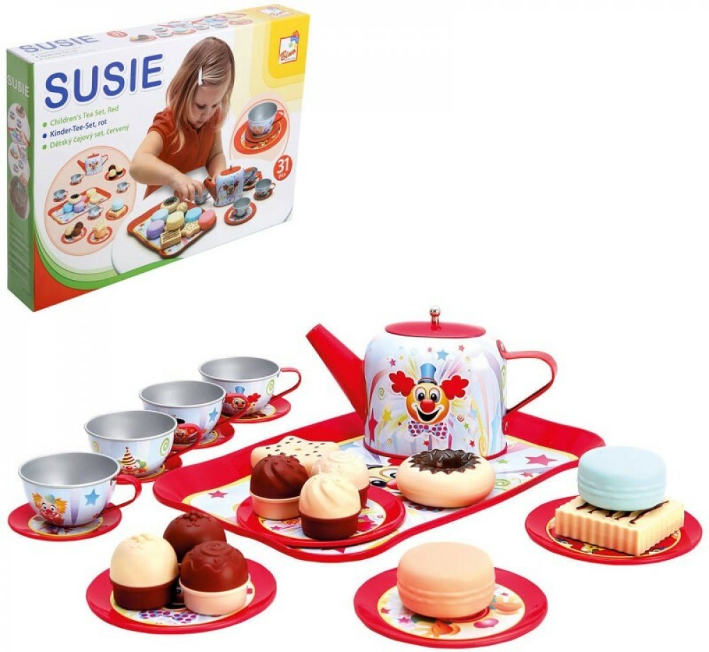 Čajový servis je zdoben roztomilými cirkusovými motivy a ilustracemi zábavného klauna. Vaše děti si zamilují tento speciální design a užijí si hodiny odpoledního čaje s touto kovovou čajovou soupravou pro panenky se servírovacím podnosem a pár kousky sladkostí. Děti mohou uspořádat odpolední čajový dýchánek se svými kamarády a rodinami. Tento čajový servis si můžete vzít i na piknik. Snadno se přenáší a skladuje. Děti se mohou naučit komunikovat s hosty a osvojit si čajovou etiketu. Čajový servis může zlepšit kreativitu a koordinaci rukou a očí vašeho dítěte. Skvělá interaktivní hra pro rodiče a děti. Vyrobeno z vysoce kvalitního kovového a plastového materiálu s hladkými hranami. Věk: od 3 let, Rozměry balení: 42,5x29,5x7 cm, Počet dílů: 31 ks, Materiál: plast, kov.