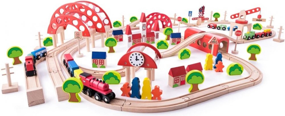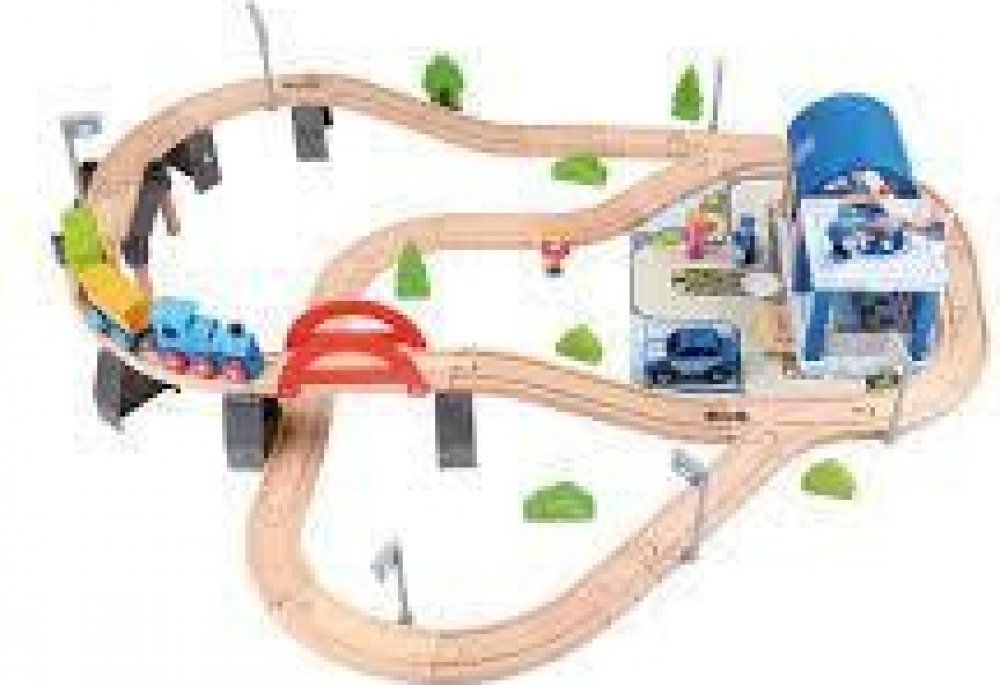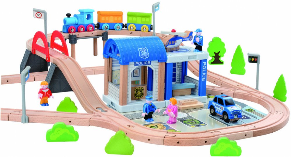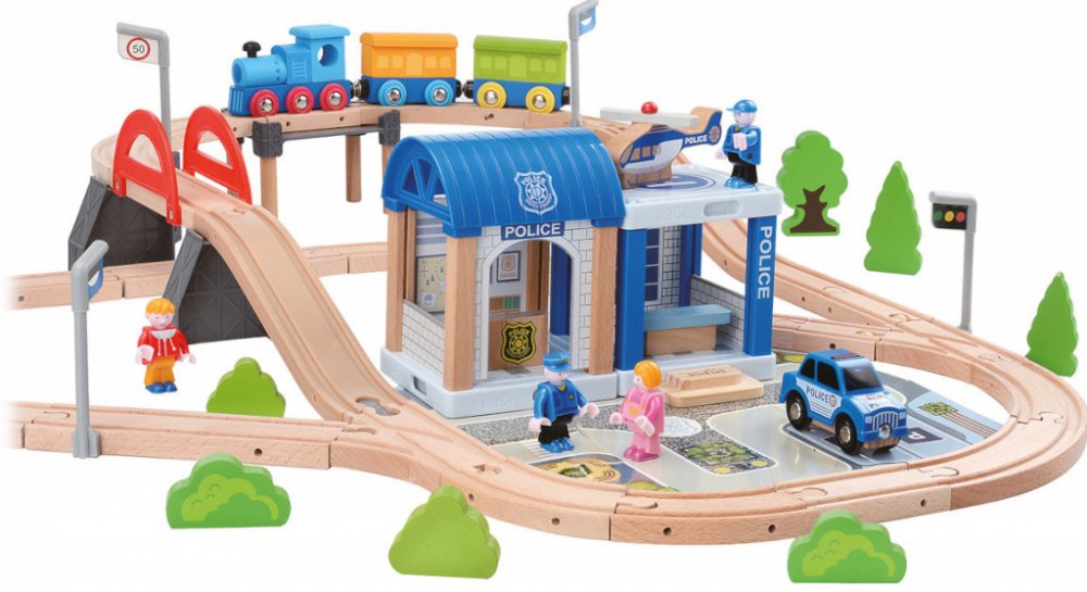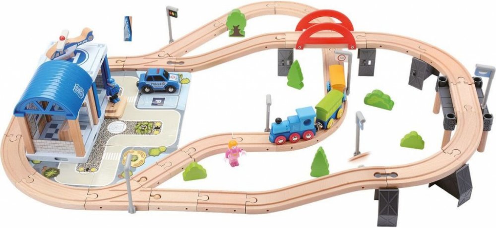 Součástí je 3dílný dřevěný vláček, velmi dobře vybavená policejní stanice včetně vrtulníku a různé dekorativní prvky pro pestrou a dlouhodobou zábavu.