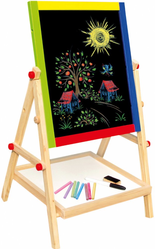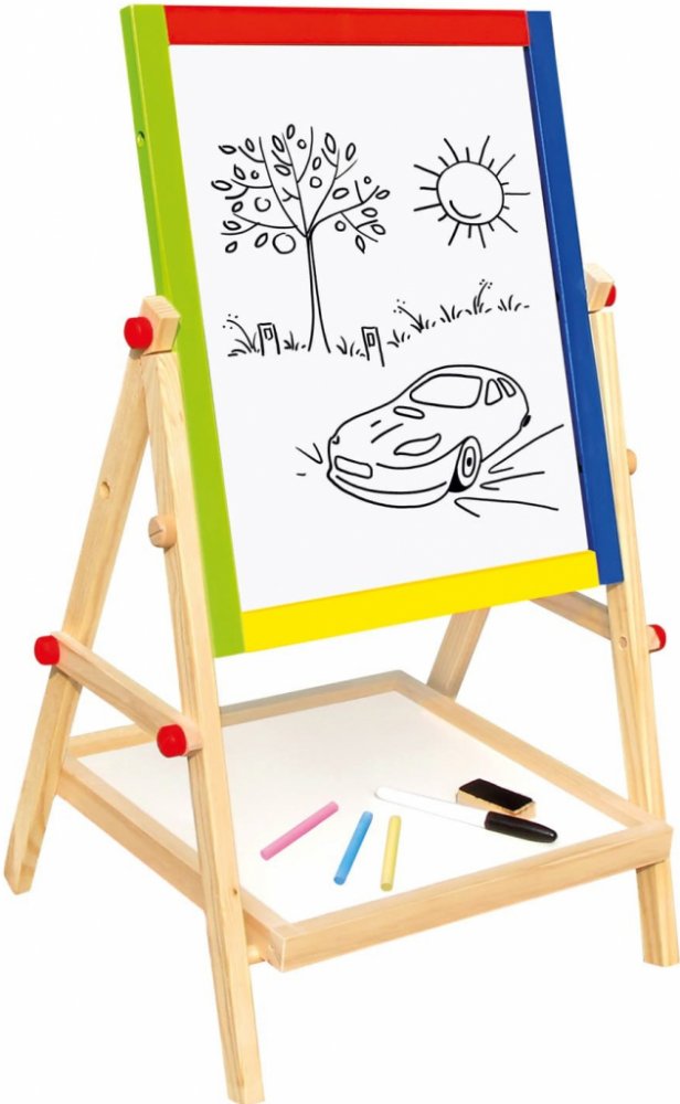 Dětský dřevěný skládací stojan. Obsahuje 61 dílů. Jedna strana stojanu je bílá a magnetická, na kterou se dají magnetem přichytit různé obrázky, které jsou součástí balení, nebo je určena pro psaní fixou. Druhá strana je břidlicová, přizpůsobena na psaní křídou. Balení obsahuje křídu, fixu, houbičku a několik magnetických obrázků. Stojan nabízí dostatečně velký herní prostor pro kreativní malé dět...