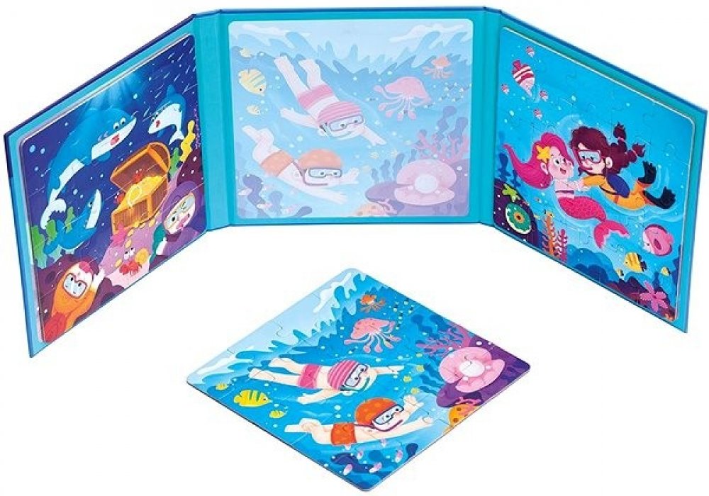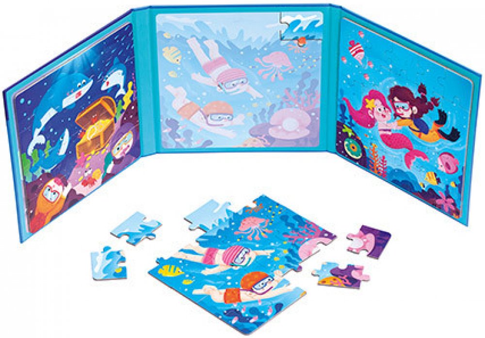 Magnetické puzzle 3 v 1 je skvělou zábavou pro děti. Při sestavování třech různých obrázků z mořského prostředí si děti zdokonalují rozpoznávání tvarů, barev a rozvíjejí tak své poznávací dovednosti. Skládat mohou podle návodných obrázků nebo bez nich, s vyšší obtížností. Magnetické puzzle je vhodné také na cesty, dílky skládačky se díky magnetu přichytí, takže nedochází posunu dílků nebo ke ztrátě.