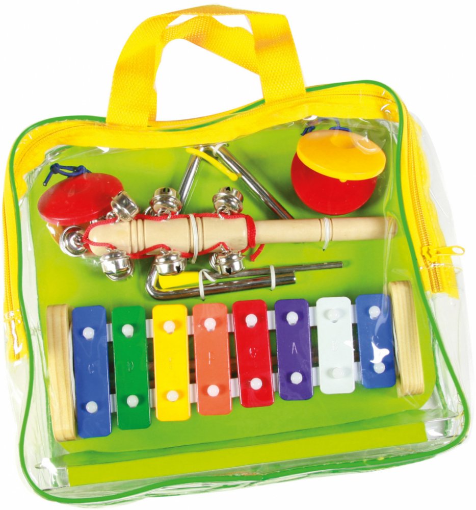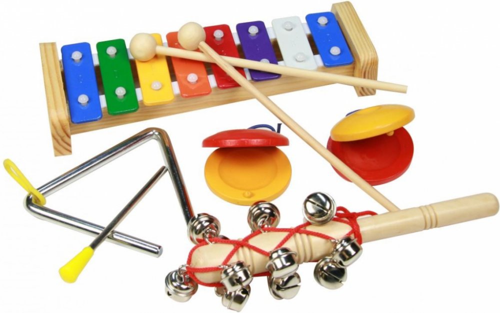 Pro malé muzikanty je určen hudební set se čtyřmi hudebními nástroji - xylofonem s osmi tóny a dvěma paličkami, kastaněty, zvonkohrou a trianglem. S těmito nástroji si děti mohou vytvořit svůj vlastní
