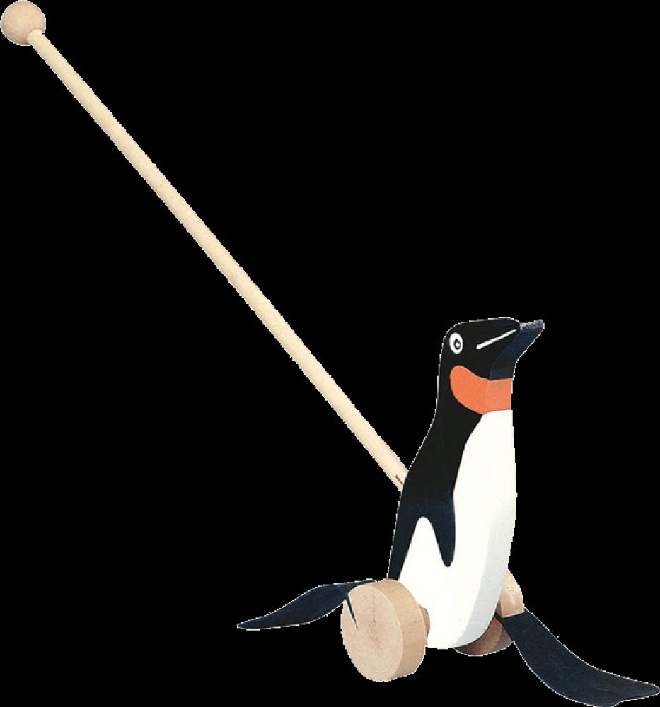 Tučňák na tyči - dřevěná tahací hračka pro malé děti. Je vyrobena z kvalitního dřeva. Tučňák je na tyči a má kolečka. Když jej dítě tlačí před sebou, tučňák si našlapuje.