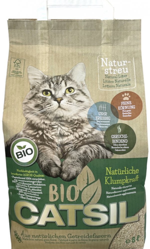 Bio-Catsil podestýlka pro kočky je ideální volbou pro přírodní péči o kočky. Tento kočkolit na rostlinné bázi je vyroben z obnovitelných obilných vláken a je zcela biologicky rozložitelný a kompostovatelný. Bio-Catsil podestýlka zaujme pevným hrudkujícím povrchem, díky kterému je čištění odpadkového koše hračkou. Je mimořádně savý, rychle absorbuje tekutiny a spolehlivě váže nepříjemné pachy. Podestýlka má také mimořádně nízký obsah prachu, takže je šetrná k dýchacím cestám a zajišťuje čisté prostředí. Jemná zrnitost je šetrná k citlivým tlapkám kočky a umožňuje snadné odstranění prostřednictvím toalety. Bio-Catsil podestýlka pro kočky: Podestýlka na rostlinné bázi Vyrobeno z přírodních obilných vláken: obnovitelná surovina, 100% biologicky odbouratelná a kompostovatelná Tvorba pevných hrudek: snadné odstranění pro čištění Velmi savá: rychle absorbuje tekutiny Dobrá absorpce pachů: spolehlivě eliminuje nepříjemné pachy Obzvláště nízký obsah prachu: šetrný k dýchacím cestám, pro čisté prostředí Jemná zrnitost: šetrná k tlapkám Snadná likvidace: lze ji zlikvidovat přes toaletu Přírodní: bez chemických přísad Ekologický obal: v papírovém sáčku Pokyny pro likvidaci: Likvidace prostřednictivím domácí toalety v přiměřeném množství! Splachování toaletou je určeno pouze pro jednotlivé hrudky! Ty vložte do toalety a nechte na chvíli namočit. Poté důkladně spláchněte – voda musí dostatečně spláchnout částice hrudek. Teprve pak vhoďte do toalety další hrudky. V žádném případě nedávejte do toalety několik hrudek odpadu najednou. Pro likvidaci a vyprázdnění zbytku použité náplně kočičí toalety použijte – v závislosti na místních předpisech pro likvidaci – bio nádobu, kompost nebo směsný odpad!