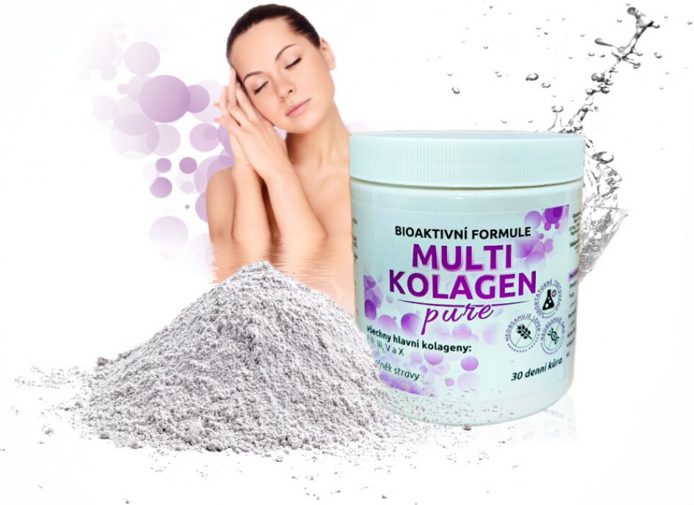 Doplněk stravy Multi Kolagen pure je kombinací 4 typů kolagenů, což činí z tohoto doplňku stravy komplexní formuli s pozitivním účinkem na organismus. V pečlivě připravené směsi jsou zastoupeny všechny nejdůležitější kolageny typu I, II, III, V a X, což může přispívat ke zlepšení kvality vlasů, zlepšení pružnosti pokožky a komplexní regeneraci kloubů, kostí a tkání v těle.