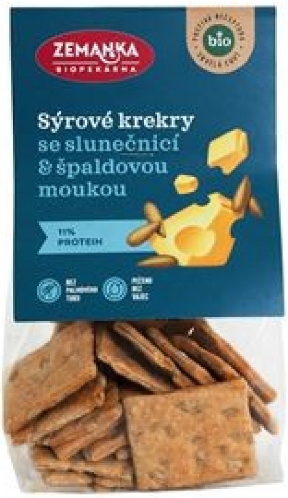 Složení: Bio pšeničná mouka hladká, bio pšeničná mouka celozrnná, bio špaldová mouka celozrnná 14 %, bio slunečnicový olej HOSO, bio slunečnicové semínko 7,3 %, bio gouda 5,6 % (bio pasterované kravské mléko, jedlá sůl, škrob, mlékárenské kultury, mikrobiální siřidlo), mořská jedlá sůl, bio sojová omáčka (pitná voda, sojové boby, pšenice, jedlá sůl, fermentační činidlo Aspergillus oryzae), kypřící prášek z vinného kamene (bio kukuřičný škrob, kypřící látky: vinnany draselné, uhličitany sodné). Použitá kypřící látka neobsahuje fosfáty. Může obsahovat stopy vajec, skořápkových plodů (lískové a vlašské ořechy) a sezamu. Výživové údaje na 100 g Energetická hodnota 1495 KJ /358 kcal Tuky 17 g - z toho nasycené mastné kyseliny 2,5 g Sacharidy 41 g - z toho cukry 1,2 g Bílkoviny 11 g Sůl 2,14 g Hmotnost 100 g Trvanlivost v měsících 6
