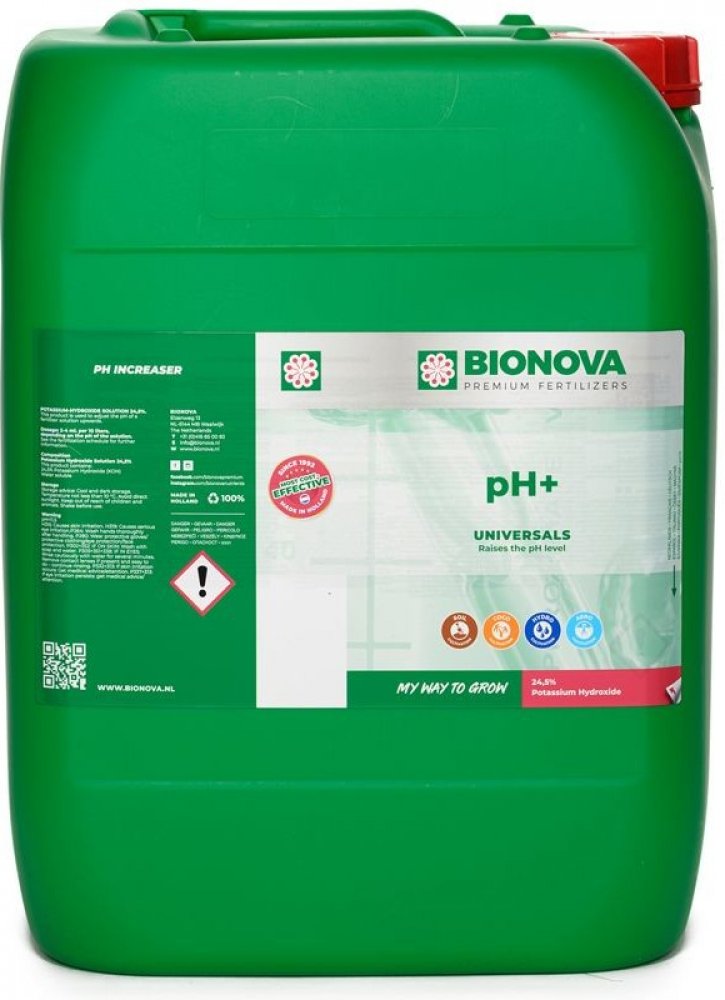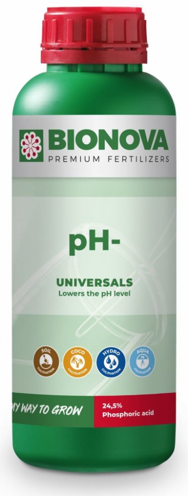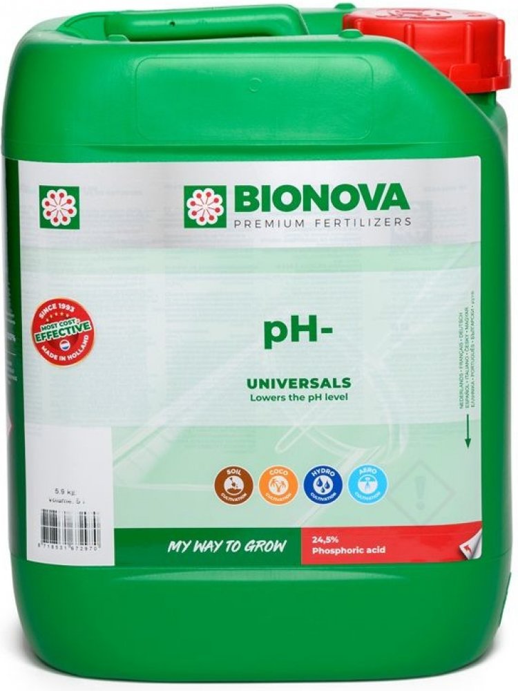 Bionova pH- je roztok fosforečné kyseliny obsahující 24,5%, který je důležitý pro regulaci pH hodnoty vody nebo živného roztoku, který rostlinám dodáváte. Rostliny dokážou vstřebávat živiny pouze při správné pH hodnotě, a pokud je pH příliš nízké nebo vysoké, rostliny nebudou schopné všechny živiny efektivně vstřebat.