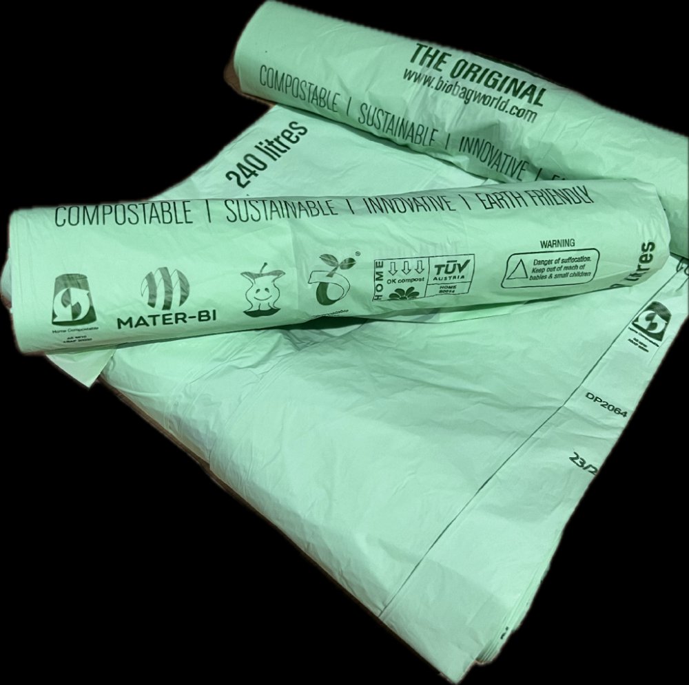 Kompostovatelné pytle do popelnic a kontejnerů BioBag jsou 100% rozložitelné. Jsou vyrobeny z patentovaného materiálu Mater-Bi, který je složen ze 70 % z kukuřičného škrobu a 30 % z upravených polymerů, které jsou rozložitelné bakteriemi na CO2, biomasu a vodu. Při výrobě se využívá výhradně energie z obnovitelných zdrojů - vlastní solární a bioplynové elektrárny.