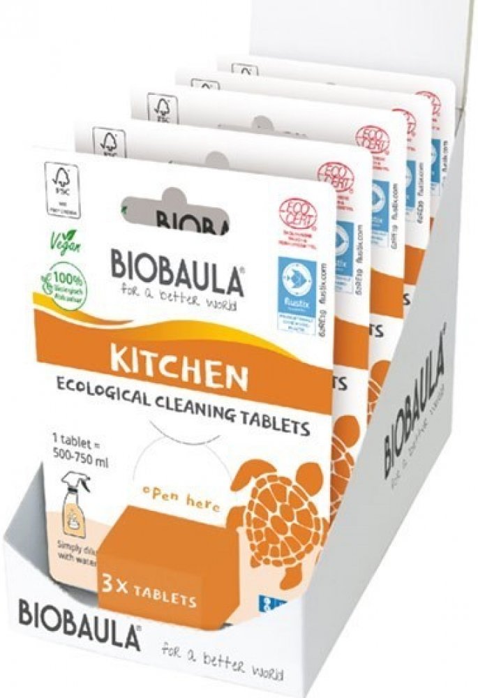 Čistící prostředek od značky Biobaula v tabletách - k čištění kuchyní. Složení bylo speciálně vyvinuto pro odstranění tuků a pro použití jako víceúčelový čistič do kuchyně. Jedno balení obsahuje 3 tablety, ze kterých vzniknou 2-3 litry čistícího prostředku.