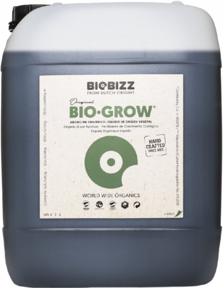 Základní růstová výživa BioBizz Bio Grow posiluje od druhého týdne kořenový a celkový rozvoj rostlin po celý pěstební cyklus. 100% bio hnojivo na podporu růstu. N-P-K : 4-3-6 Zaručené složky : Dusík(N)-8.0%;(NH4)-4.0%;Dusičnan(NO3)-4%;Fosfor(P2O5)-2.0%; Draslík(K2O)-6% Použití Kompletní tekutá výživa rostlin. Určen k použití během celého období rostliny (vegetačního i kvetoucího období). Upozornění: Před použitím dobře protřepat Aplikovat dle návodu Skladovat mimo dosah dětí Skladování : ve tmě a chladu Tento vedlejší produkt přeměny cukrové řepy nebo cukrové třtiny na cukr se vytváří přirozeným kvašením. Škroby v cukru jsou poté ošetřeny enzymy za vzniku glukózy, které spolu s dalšími rostlinnými živinami pomáhají produkovat bohatý zdroj potravy pro půdní mikroby a zvyšují jejich populaci pro produktivnější půdu. Přírodní cukry a draslík v Bio-Grow aktivují bakteriální flóru v substrátu, aby vám zajistily dostatek sklizně lahodně sladkého ovoce. Začněte s ním, jakmile se objeví první listy, když je rostlina vysoká 10 - 15 cm. Potom pokračujte v používání Bio-Grow až do konce produkce ovoce.