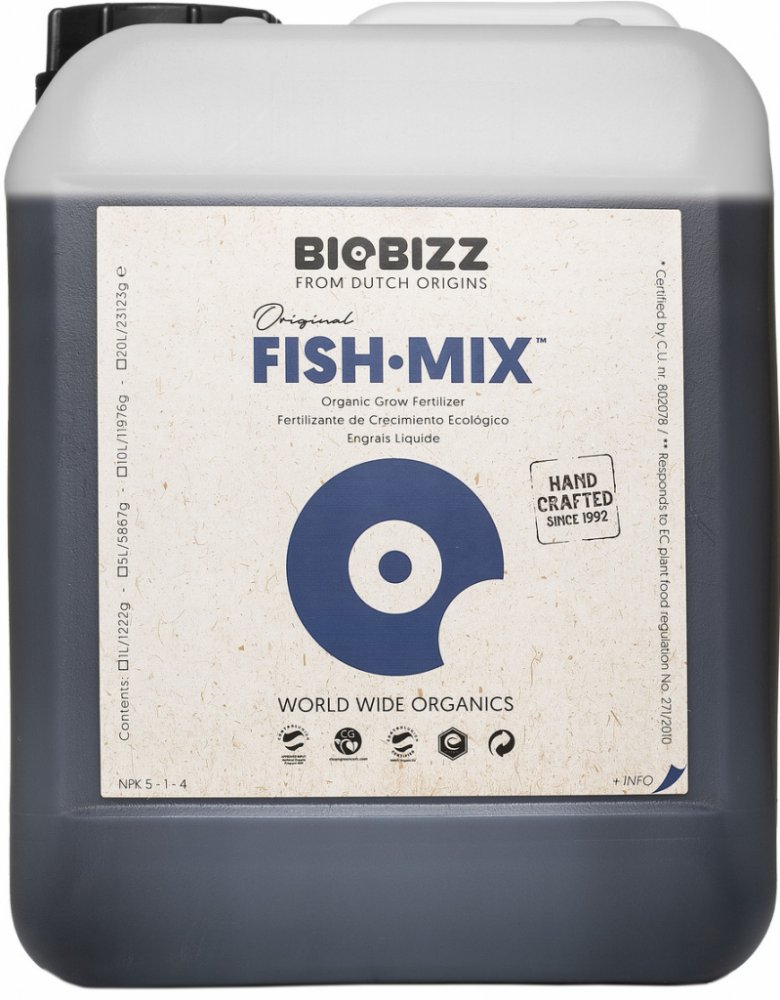 Fish-Mix pečuje o substrát, povzbuzuje bakteriální flóru a urychluje růst. Jedná se o výluh z organické rybí emulze a extrakt z holandské cukrové řepy. Rybí emulze se hodí jako účinný doplněk obyčejných nebo částečné vyčerpaných substrátů. Pro použití Fish-Mixu indoor doporučujeme větrané prostory, nebo filtraci vzduchu přes pachový filtr z důvodu jeho specifickému zápachu.