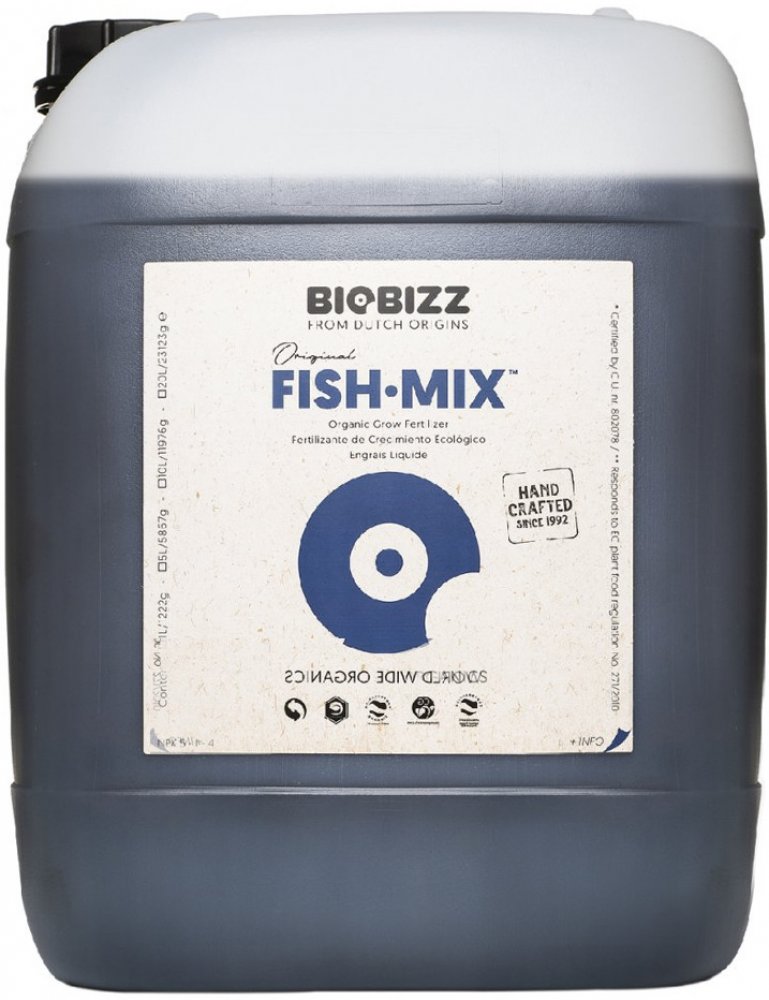 Bio hnojivo na růst BioBizz Fish Mix 20 l obsahuje NPK živiny přírodního původu. Používá se ve fázi růstu i květu. Je kompatibilní s většinou pěstebních metod (zemina a kokos, kromě hydroponie), zavlažovacími systémy a BioBizz substráty.