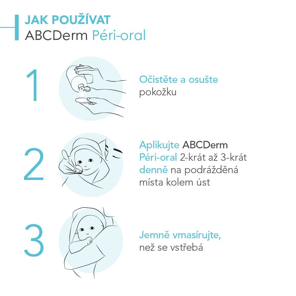 Přípravek Bioderma ABCDerm Péri-oral naneste 2 anebo 3 krát za den na podrážděná místa v okolí úst.