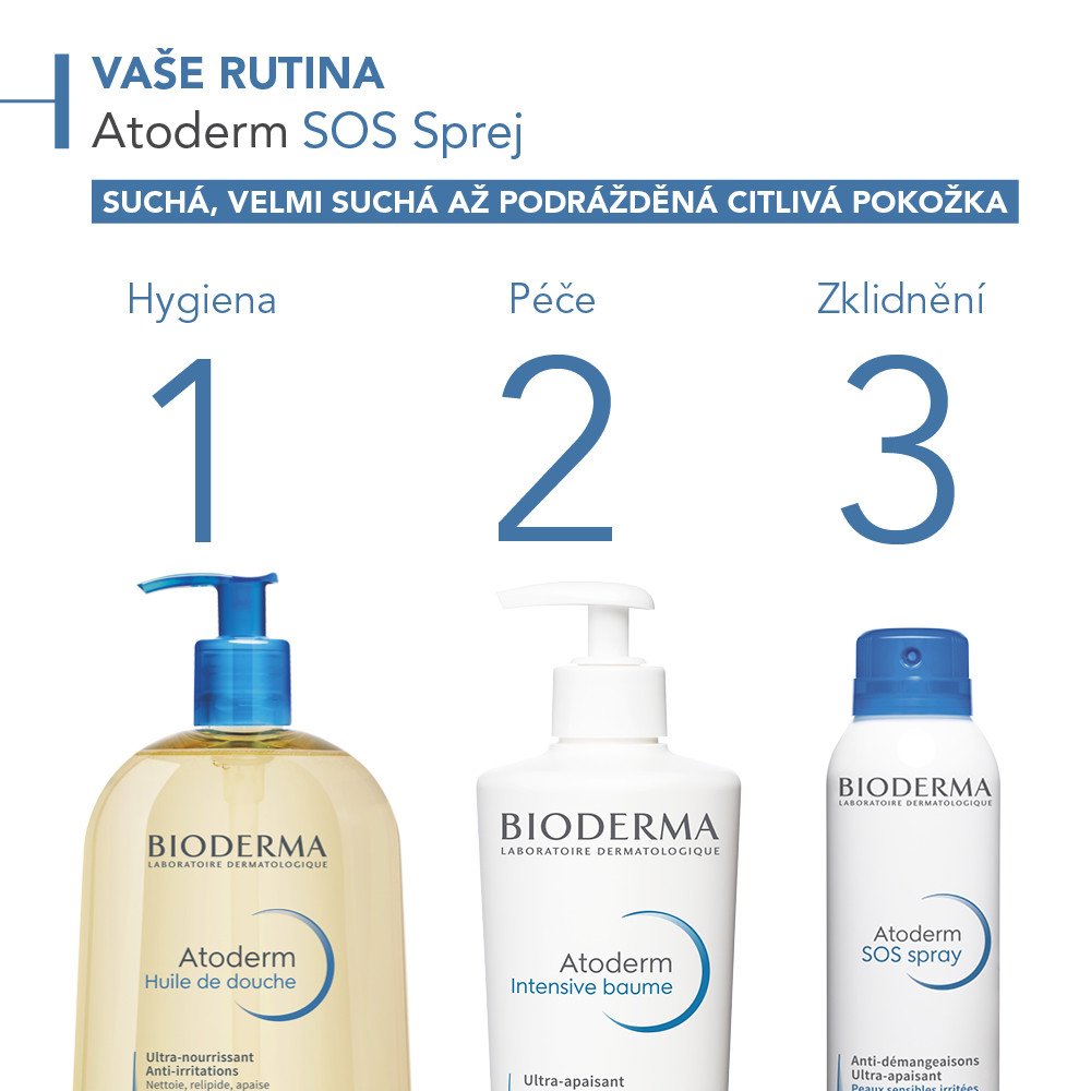 - zklidňující sprej Bioderma SOS pro okamžitou úlevu, dlouhotrvající hydrataci a intenzivní ochranu podrážděné, suché a atopické citlivé pokožky