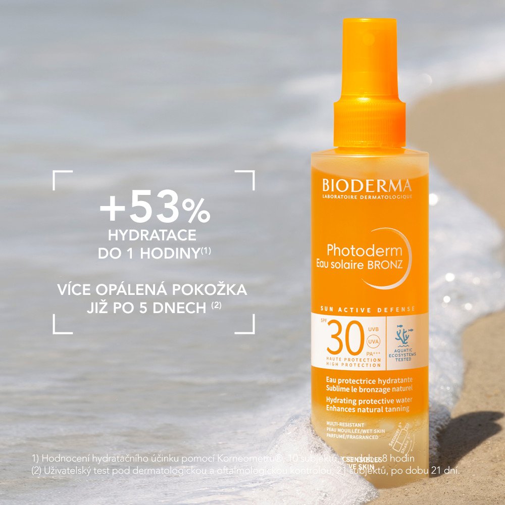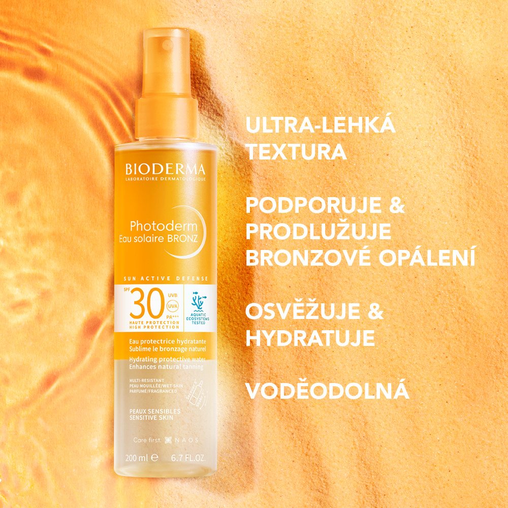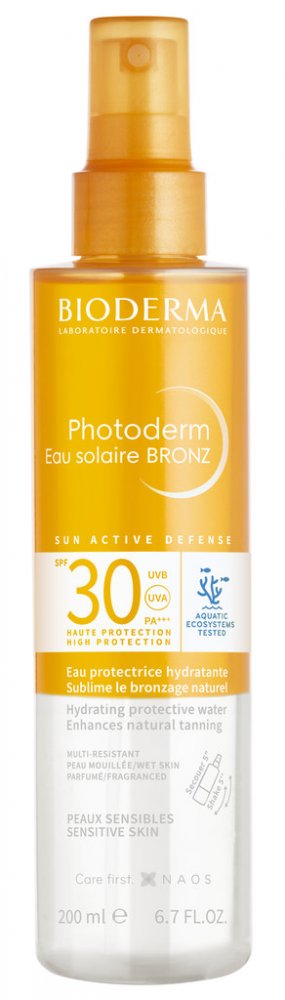 Bioderma Photoderm BRONZ Opalovací voda SPF 30 je ultra lehká hydratační voda, která pokožku chrání před UV zářením. Díky dvoufázovému složení poskytuje pokožce nejen vysokou ochranu, ale zabezpečuje i potřebnou hydrataci. Bronz Komplex biologicky stimuluje přirozený proces opalování, takže vaše pokožka získá krásné opálení snadno a na delší dobu.