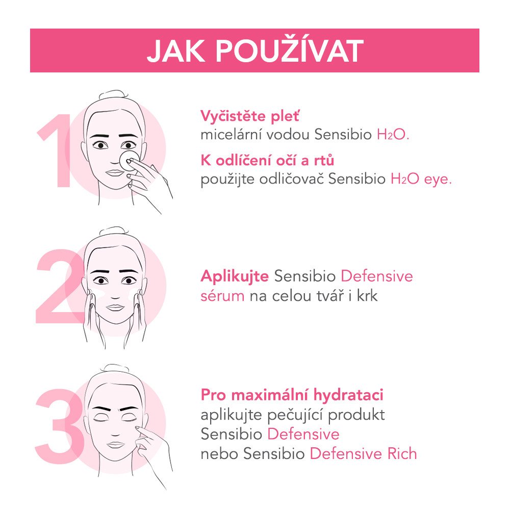 Před použitím dobře protřepejte. Ráno a večer naneste pár kapek na obličej a krk po očištění SENSIBIO AR+ MICELÁRNÍM GELEM. Potom aplikujte produkt péče o pleť z řady SENSIBIO AR+.