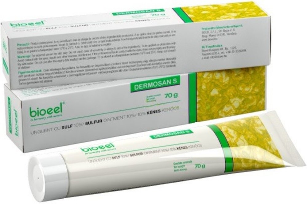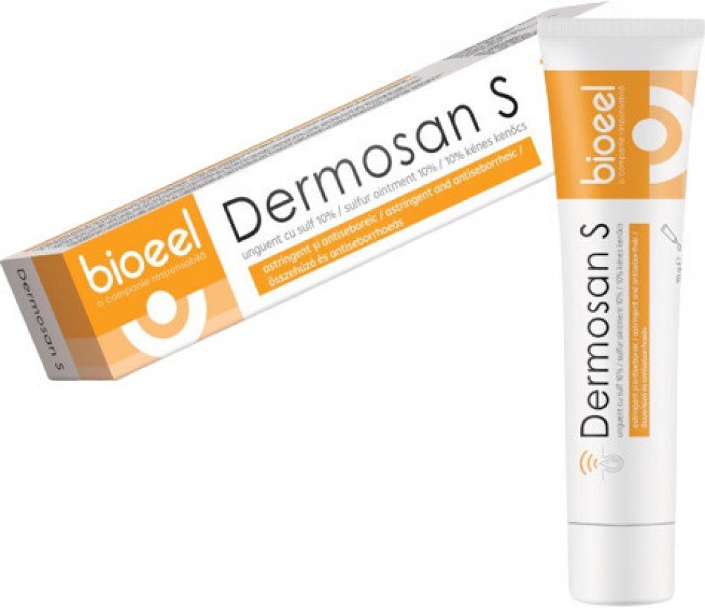 Dermosan S mast se sírou je určena k ošetření pokožky obličeje a jiných částí těla při aknózních projevech seboroických a rozaceiformních zánětech kůže. Mast je antimykotická. Má zvlhčující a uklidňující účinek.