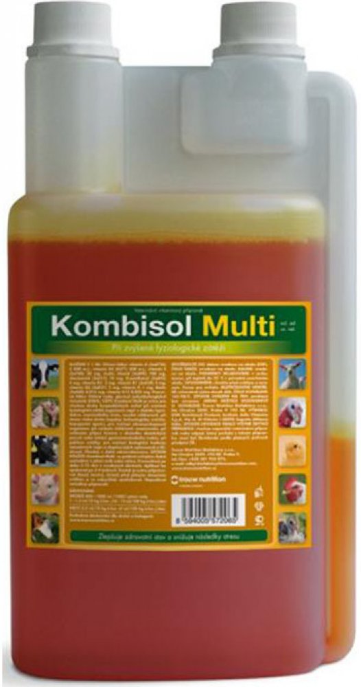 Další parametrySložení v 1 ml: vitamin A 5 000 m.j., vitamin D3 500 m.j., vitamin E 20 mg, cholinchlorid 100 mg, niacinamid 10 mg, D-panthenol 5 mg, vitamin B2 3 mg, vitamin B1 3 mg, vitamin B6 2 mg, vitamin K 1 mg, biotin 0,015 mg, vitamin B12 0,005 mg. Způsob aplikace: Kombisol Multi se podává zvířatům řádně rozředěný v pitné vodě nebo mléce. Preventivně po dobu 5 – 15 dnů v uvedených dávkách. Aplikaci lze opakovat po 3 – 4 týdnech. Roztok je nutno připravovat denně čerstvý, chránit před přímým slunečním světlem a co nejrychleji spotřebovat.