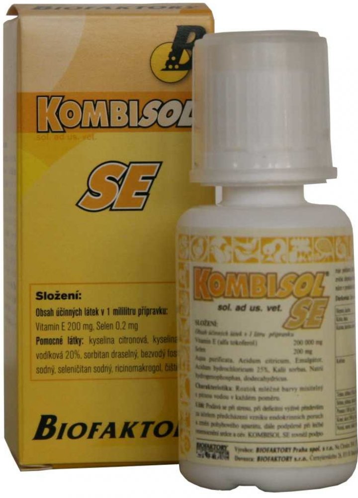 Indikace : podává se při stresu, při deficitní výživě především za účelem předcházení vzniku endokrinních poruch a změn pohybového aparátu, dále podpůrně při léčbě onemocnění srdce a cév. KOMBISOL SE rovněž podporuje pohlavní aktivitu chovaných zvířat, u výkrmových zvířat zlepšuje kvalitu masa, působí i proti náhlým úhynům v poslední fázi masných prasat a drůbeže.
