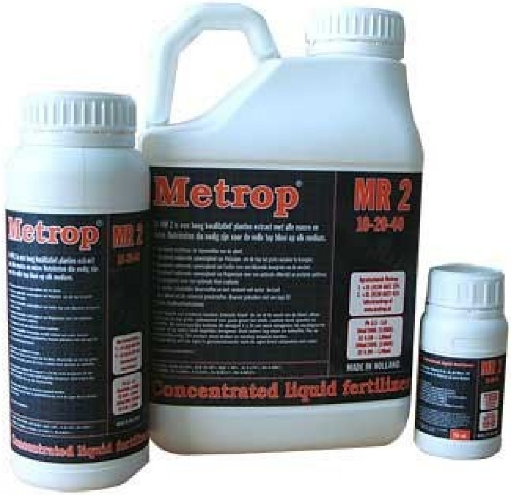 U Metrop MR2 biominerálního hnojiva pro květ je poměr N-P-K a množství stopových prvku nastaveno na maximální výnos rostlin. Základní látky pro Metrop MR2 jsou obzvláště čisté, čímž se zvýší podíly N-P-K, aniž by docházelo k poškození rostlin. Díky kvalitě těchto látek nedochází k usazeninám ani v nádobách, ani v zavlažovacím systému. Po rozpuštění ve vodě zůstává hodnota EC konstantní. Zároveň i přidané stopové prvky jsou ve vyšší koncentraci a ve velmi čisté formě, čímž fotosyntéza rostlin probíhá lépe a rychleji, což se příznivě projeví na kvalitě konečného produktu. Metrop MR2 biologické hnojivo pro květ je vysoce kvalitní rostlinný extrakt obsahující všechny makro a mikro složky potřebné pro zdravý vývoj květu v jakémkoliv pěstebním mediu. Určeno k optimálnímu rozvoji květu; Zajišťuje dostatečný přísun dusíku (dovršení růstu vrcholu); Zajišťuje dostatečný přísun fosforu (rozvoj kořenů); Zajišťuje dostatečný přísun hořčíku (optimální průběh fotosyntézy a syntézy proteinu); Neobsahuje škodlivá barviva, není ředěné vodou. Skládá se pouze z nejčistších materiálu a proto udržujte nízkou hodnotu EC; neobsahuje těžké kovy. Skladujte mimo dosah dětí. Použití: Od třetího až čtvrtého týdne květu. V závislosti na velikosti květu zvyšujte plynule koncentraci. Poslední týden proplachujte dle potřeby. Při pěstování v zemních substrátech bohatých na živiny používejte roztok jednou až třikrát týdne. V případe hydroponie používejte denně. Kontrolujte hodnotu EC. Nepřehnojte! Skladujte na temném místě, uchovejte před mrazem. Při zasažení očí vypláchnete ihned vodou. Před použitím protřepte! HNOJIVO-ES, složitá suspenze NPK hnojiva 10-20-40 se stopovými prvky: skupni dušik (N) 10.00% - dusičnanový dusík (N) 9.33% - amonného dusíku (N) 0.67% - fosfati (P) rozpustné ve vodĕ 20.00% - kalij (K) rozpustné ve vodĕ 40.00% - Magnesijev (Mg) rozpustné ve vodĕ 1.50% - železo (Fe) rozpustné ve vodĕ, chelatační činidlo EDTA 0.175% - mangan (Mn) rozpustné ve vodĕ, chelatační činidlo EDTA 0.088% - baker (Cu) rozpustné ve vodĕ, chelatační činidlo EDTA 0.088% - cink (Zn) rozpustné ve vodĕ, chelatační činidlo EDTA 0.088% - bor (B) rozpustné ve vodĕ 0.035% - kobalt (Co) rozpustné ve vodĕ, chelatační činidlo EDTA 0.0011% - molibden (Mo) rozpustné ve vodĕ 0.0012%.