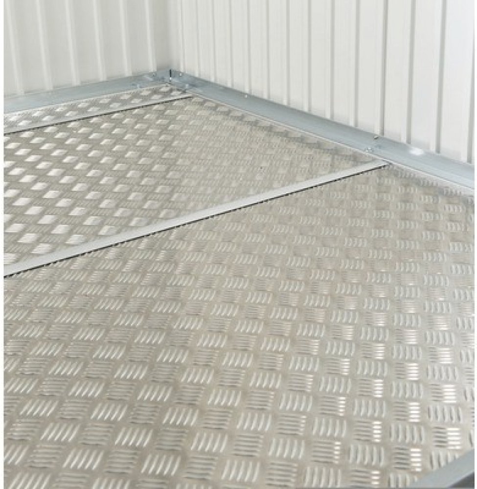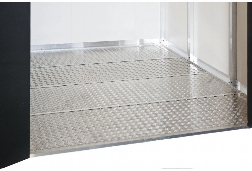 Hliníkové podlahové desky Biohort pro domky na nářadí, skříně a stojany jsou vysoce kvalitní podlahou z hliníkového žebrovaného plechu o tloušťce 2 mm. Chrání před vlhkostí stoupající od země. V závislosti na velikosti domku je podlaha tvořena 1 až 5 díly včetně spojovacích profilů. Pro přesné položení je potřebný hliníkový podlahový rám (není součástí).