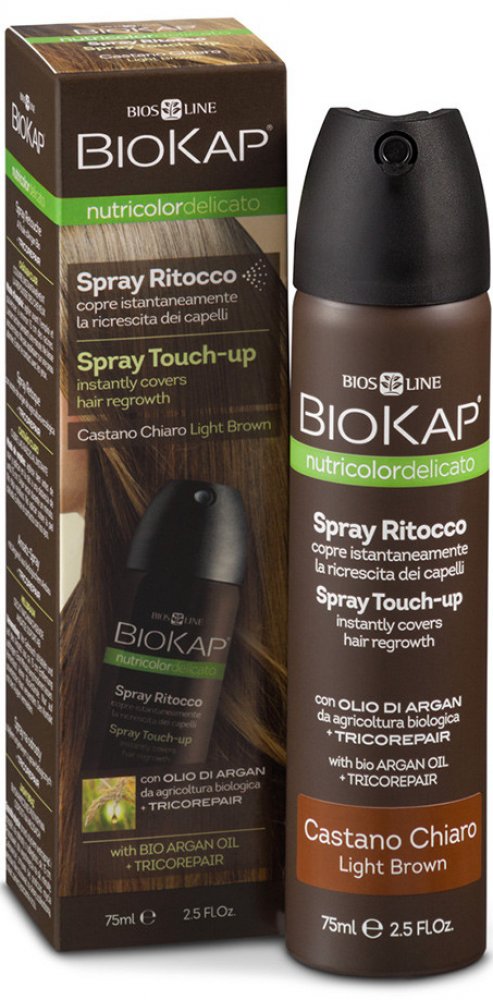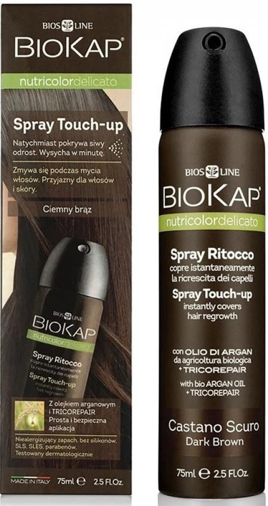 BIOKAP Nutricolor Delicato Spray Touch Up Hnědá tmavá. Velice snadno se nanáší, barva dobře kryje i drží, nezanechává stopy na pokožce ani na oděvu. Vydrží do prvního umytí šamponem. Regeneruje a chrání díky obsahu formule Tricorepair Complex (výtažky z vrby, rýžový protein, lypophylické kyseliny, BIO arganový olej.) Sprej je obohacen také o panthenol (vitamín B5), který dodává vlasům hydrataci a ...