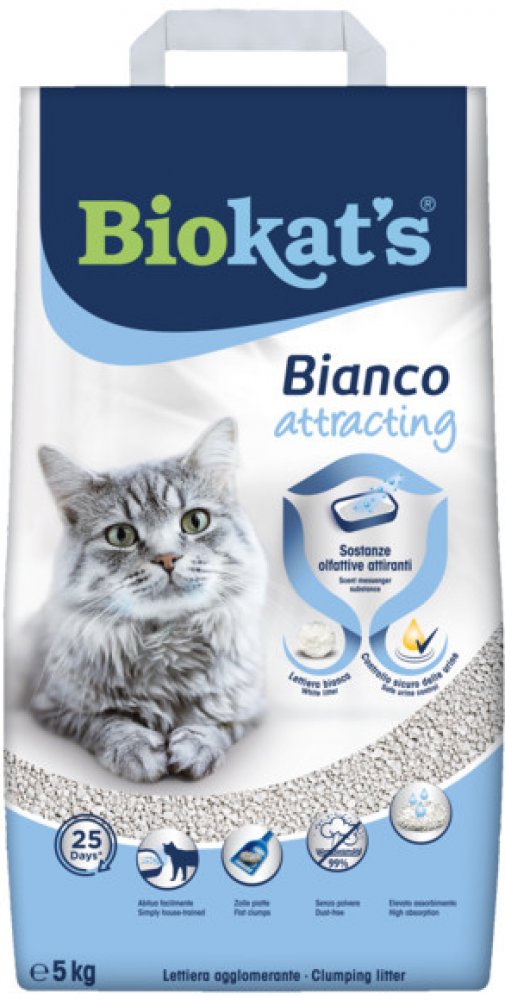 Kvalitní podestýlka Biokats Bianco je silně hrudkující podestýlka bílé barvy. Podestýlka skvěle pohlcuje pach a je bezprašná. Navíc má úžasnou až 120% absorpční schopnost. Na dno toalety nasypeme do výšky 2-3 cm stelivo. Z toalety vybíráme pouze exkrementy a hrudky a průběžně dosypáváme, dokud stelivo nezapáchá. Pak jej vyměníme celé. Balení: 5 kg.