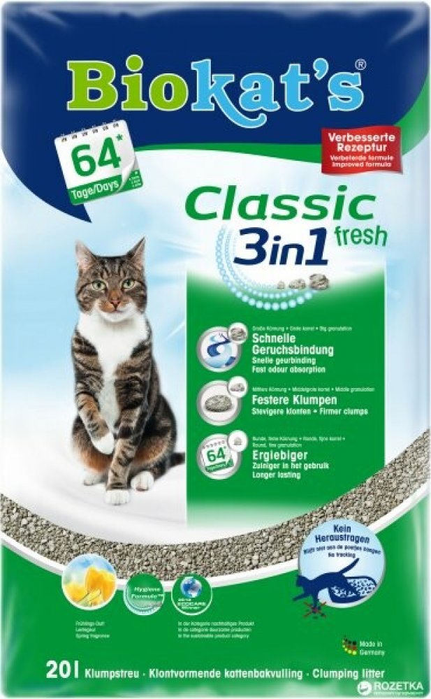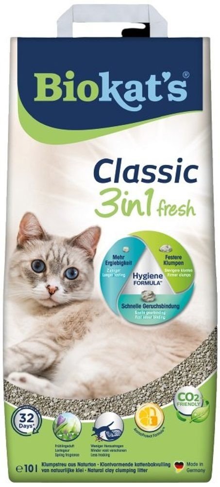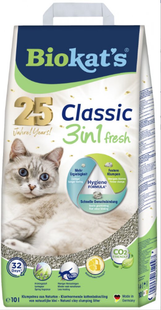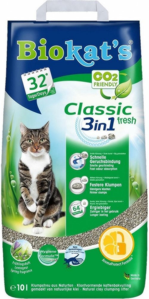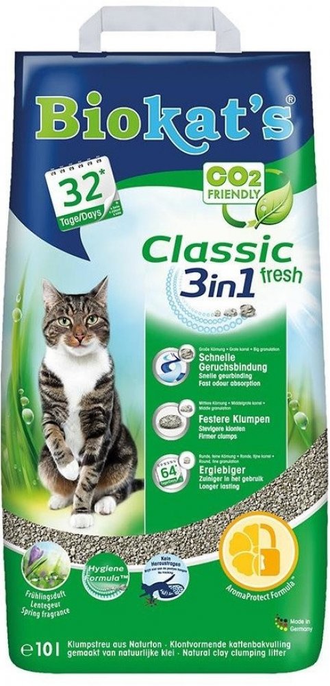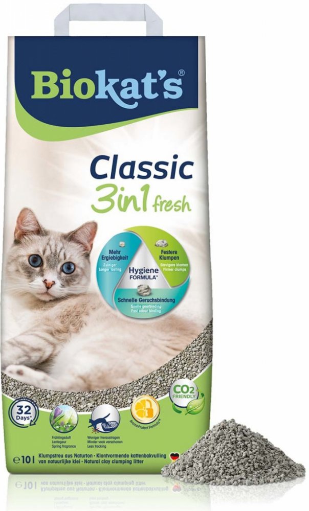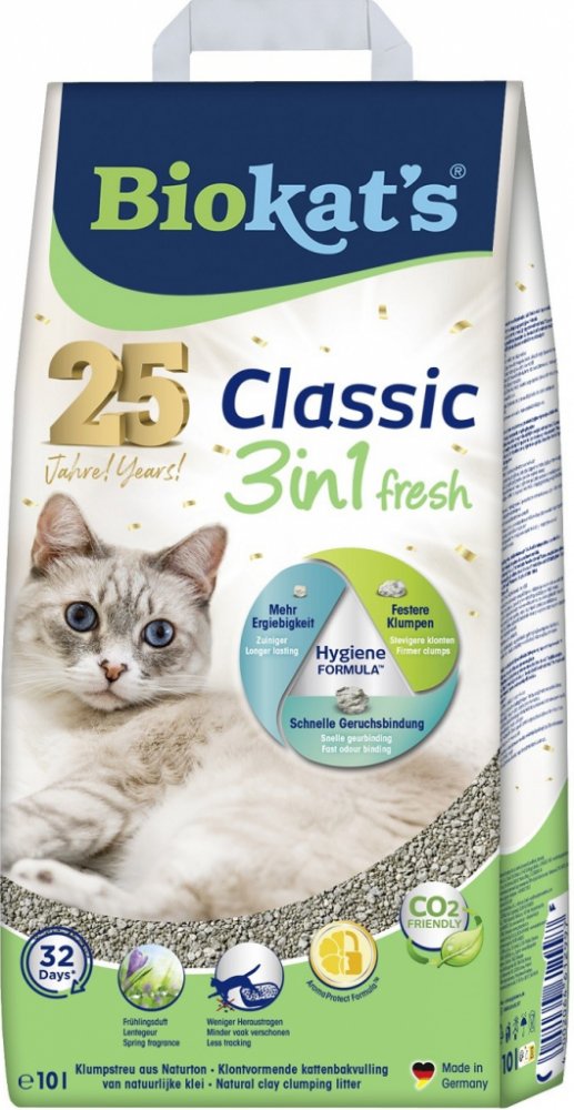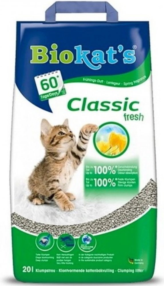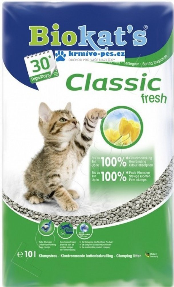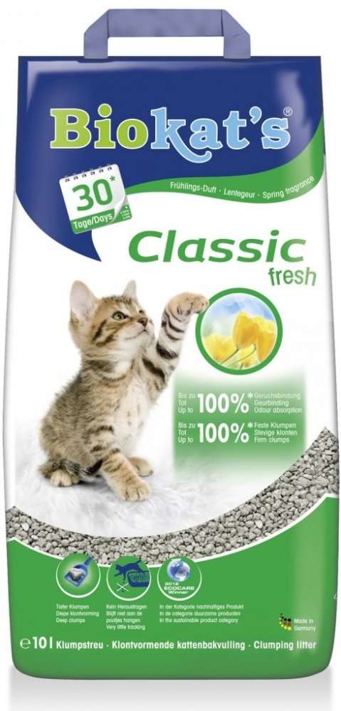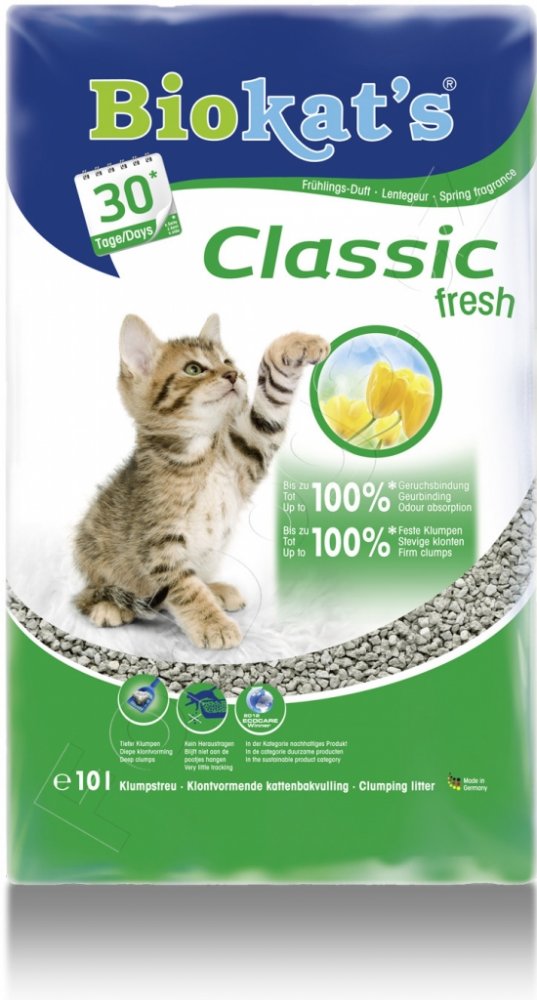 Mnohoúčelové stelivo s vysokou savostí je složeno z extra kvalitního přírodního jílu, díky kterému tato hrubozrnná podestýlka dlouhodobě zadržuje zápach. Kvalitní stelivo Biokat's vytváří velmi pevné hrudky. Biokat´s Classic Fresh je složen ze 3 různých velikostí zrn - velká, střední a malá. Velká zrna nasávají kapalinu a zápachy. Střední a malá zrna podporují optimální funkčnost velkých zrn. Produkt uchovávejte v suchu.