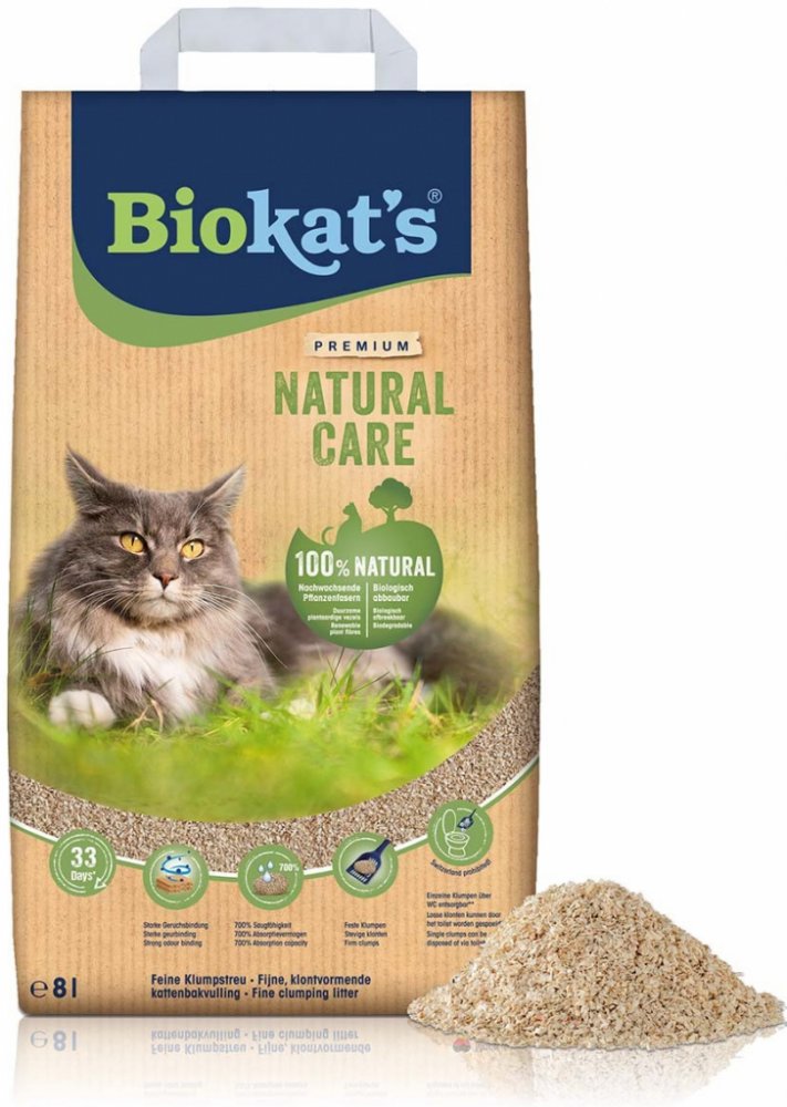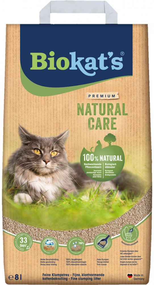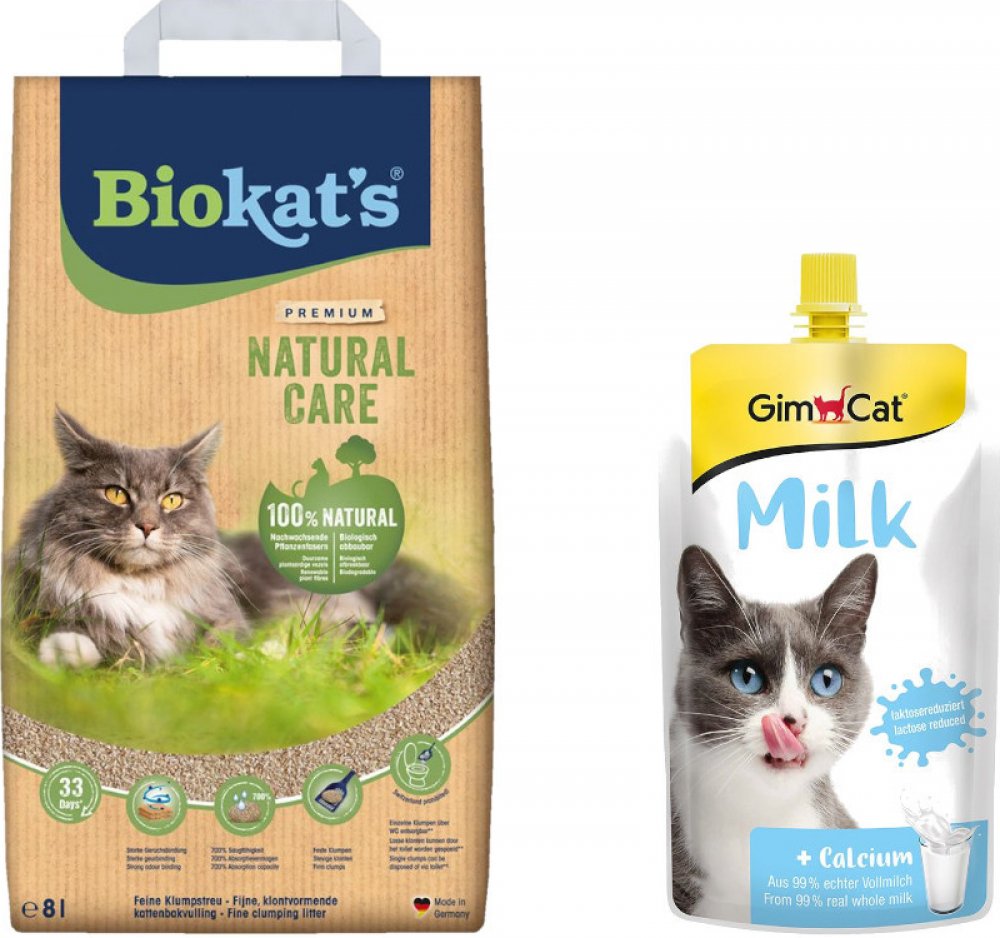 Kočkolit Biokat´s Natural Care je ideální pro všechny tygříky a jejich majitele, kteří kladou velký důraz na hygienu a čistotu, stejně jako na přirozený pocit v toaletě. Skládá se z čistě biologicky odbouratelných rostlinných vláken, která jsou kompostovatelná a přirozeně a dlouhodobě vážou nepříjemné pachy. Váš chlupatý přítel se tak bude při chození na toaletu cítit naprosto pohodlně. Kočkolit Biokat's Natural Care je obzvláště savý. Jemné granule absorbují až 700 % své hmotnosti v kapalině a tvoří pevné hrudky, které lze snadno odstranit. Tím je zajištěna dlouhotrvající svěžest a čistota. Přírodní rostlinná vlákna navíc poskytují měkký povrch, který je příjemný i pro citlivé kočky. Biokat's Natural Care: Kočkolit vyrobený z čistě přírodních surovin Šetrné k životnímu prostředí: vyrobeno z biologicky odbouratelných a kompostovatelných rostlinných vláken Udržitelnost: kvůli kočkolitu se nekácí žádné stromy, vyrábí se pouze z druhotných dřevěných surovin z dřevařského průmyslu s certifikací PEFC Vysoká absorpční schopnost: absorbuje až 700 % své hmotnosti v kapalině Váže nepříjemné pachy: pro dlouhotrvající svěžest Pro snadné čištění: tvoří hrudky, které lze snadno vyjmout Měkké a prakticky bezprašné: vhodné i pro citlivé kočky Upozornění: Jednotlivé hrudky lze také snadno a hygienicky vyhodit do toalety. Za tímto účelem vložte hrudky jednotlivě do toalety, nechte je krátce rozpustit a poté je silně spláchněte. Nevhazujte do toalety několik hrudek najednou! Zbytky kočičí toalety není vhodné vyprazdňovat přes domácí toaletu, ale přes kompost, koš na organický odpad nebo zbytkový odpad. Dodržujte přitom obecní předpisy. GimCat mléko: Doplňkové krmivo pro kočky Přírodní produkt: vyrobeno ze skutečného plnotučného mléka Bohaté na vápník: obsažený vápník může přispívat k udržení zdravého stavu kostí Se sníženým množstvím laktózy: obzvláště dobře stravitelné Velice lahodné: vynikající, smetanová chuť, krémové a lákavé Bez přidaného cukru Bez barviv a konzervantů Země výroby: Německo Praktická kapsička: uzavíratelná Můžete podávat neředěné nebo ředěné vodou Využijte naší skvělé nabídky! Pouze po omezenou dobu: nyní při koupi 8 l Biokat´s Natural Care získáte k tomu GimCat mléko zdarma! Neopomeňte prosím, že se uvedená nabídka vztahuje pouze na produkt č. 2185847.