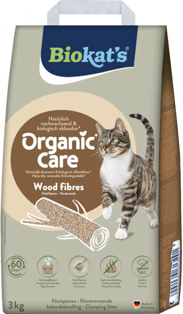 S Biokat’s Organic Care dřevěnými vlákny nabídnete své kočce přírodní, udržitelnou a mimořádně hygienickou alternativu steliva. Jemná zrnitost z druhotných dřevěných surovin zajišťuje mimořádně vysokou savost – až 7násobek vlastní hmotnosti! Přitom vznikají pevné, kompaktní hrudky, které lze rychle a snadno odstranit, aniž by se zbytek kočičí toalety znečistil. Speciální trubicová struktura dřevěných vláken spolehlivě a dlouhodobě váže nepříjemné pachy. Biokat’s Organic Care dřevěná vlákna jsou téměř bezprašná, a proto obzvlášť šetrná k citlivým kočičím tlapkám – ideální také pro choulostivé domácí kočky. Stelivo je lehké na přenášení, snadno se likviduje (prosím, dodržujte místní předpisy), vyrábí se v Německu – pro krátké přepravní vzdálenosti a ekologicky šetrnou výrobu. Biokat’s Organic Care dřevěná vlákna: Hrudkující kočičí stelivo z přírodních dřevěných vláken Mimořádně savé: pojme několikanásobek vlastní hmotnosti tekutiny Pevné, stabilní hrudky: usnadňuje čištění, udržuje toaletu déle čistou Efektivní pohlcování zápachu: přírodní vlákna neutralizují nepříjemné pachy Nízká prašnost a šetrnost k tlapkám: ideální také pro citlivé nebo mladé kočky Udržitelné a ekologické z druhotných dřevěných surovin Vyrobeno v Německu