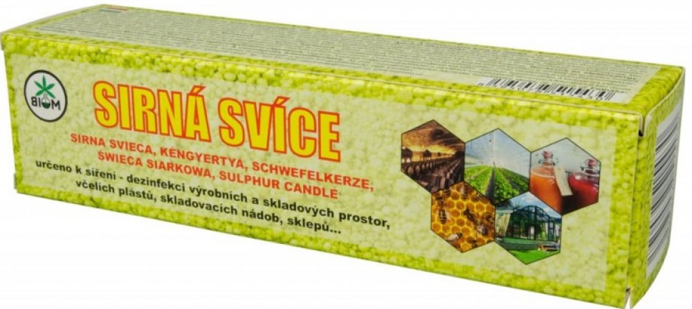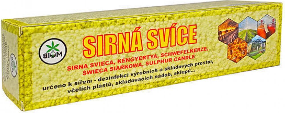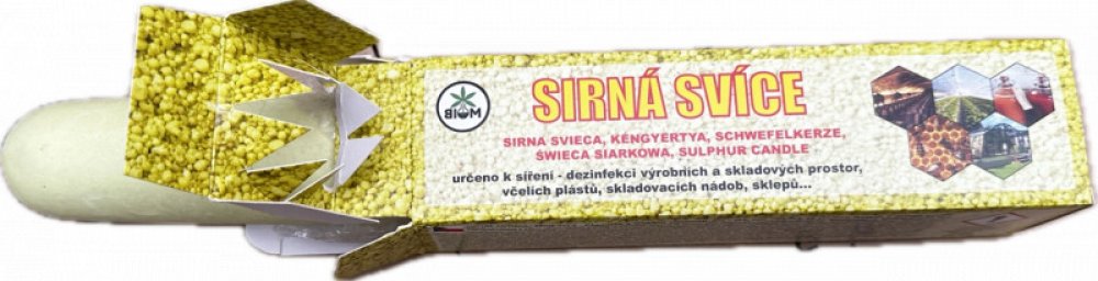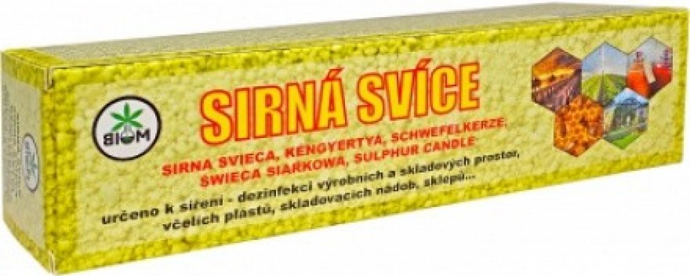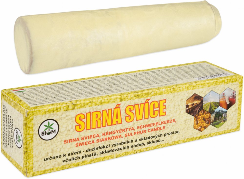 Biom sirná svíce je pomocný přípravek určený k síření sklepů, skladů a jiných uzavřených a prázdných prostor před opětovným naskladněním produktů. Sirnou svíci využijí jak včelaři, sadaři, zelináři, zahrádkáři, ale i všichni, kteří potřebují vydezinfikovat sklepy, skleníky a jiné prostory. Sirná svíce spolehlivě ničí škůdce, mikroorganismy, plísně a spory plísní.