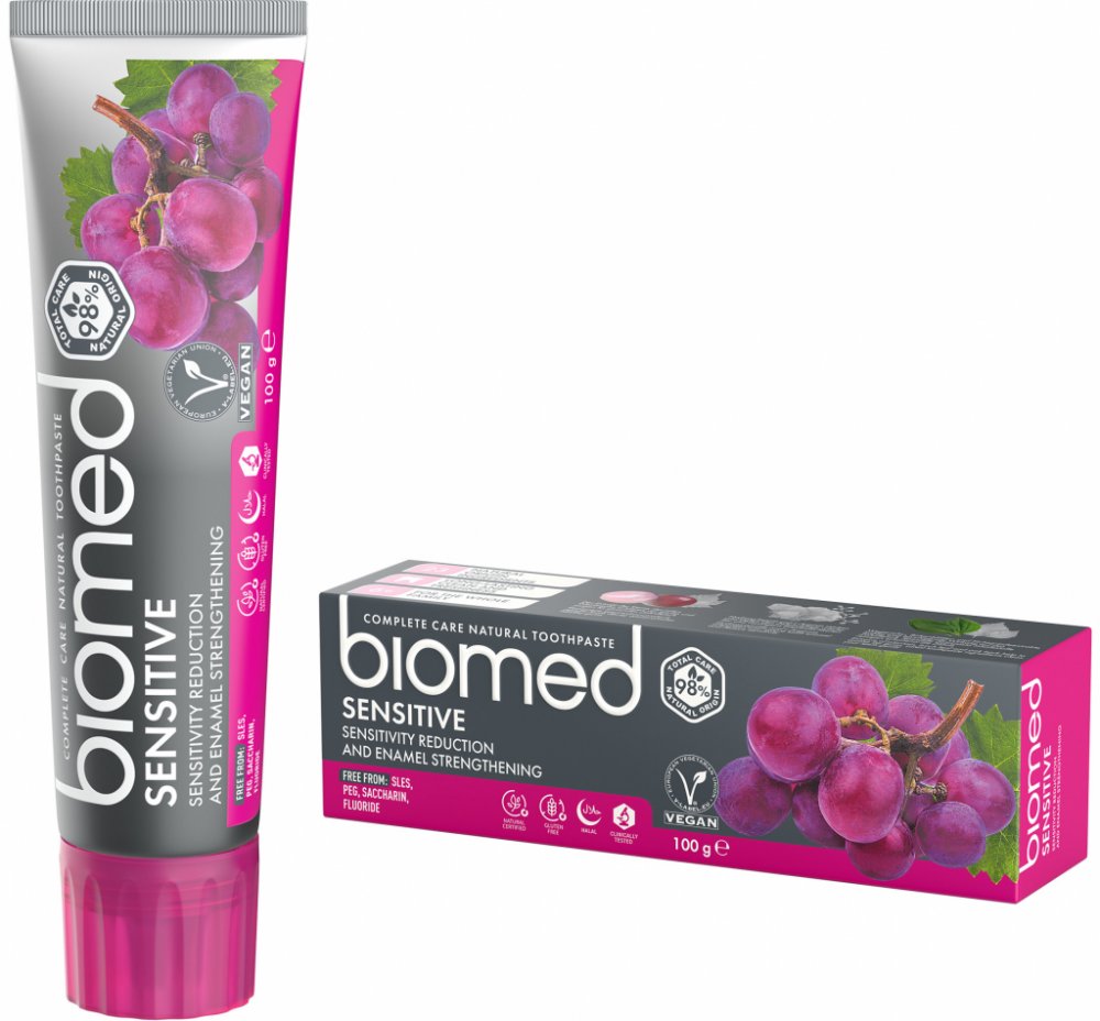 Hledáte účinnou a šetrnou zubní pastu, která vám pomůže při citlivých zubech? Biomed Sensitive BIO zubní pasta nabízí výjimečnou péči založenou na 98% přírodních složkách, bez použití fluoridu, SLS, PEG či živočišných látek. Díky obsahu amorfního hydroxyapatitu, L-argininu a přírodních extraktů z hroznových jader, dubové kůry, skořápky a břízy posiluje zubní sklovinu, zmírňuje citlivost zubů a úči...