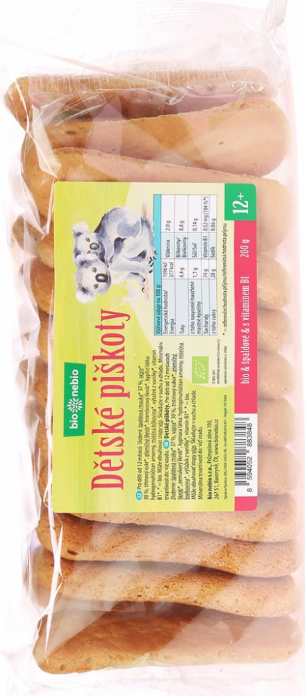 Jemné dětské piškoty ze špaldové mouky – ideální jako první mlsání nebo základ pro dezerty. Tyto BIO piškoty značky Bio Nebio jsou určeny pro děti od 1 roku. Mají jednoduché složení a přirozeně sladkou chuť díky třtinovému cukru a vanilkovému výtažku.