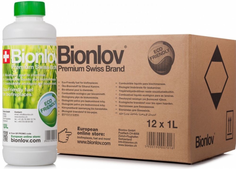 Biolíh do krbu švýcarského výrobce Bionlov. Tento biolíh do krbu má špičkovou kvalitu (čistotu) a je dodáván v lahvích o objemu 1 litr.