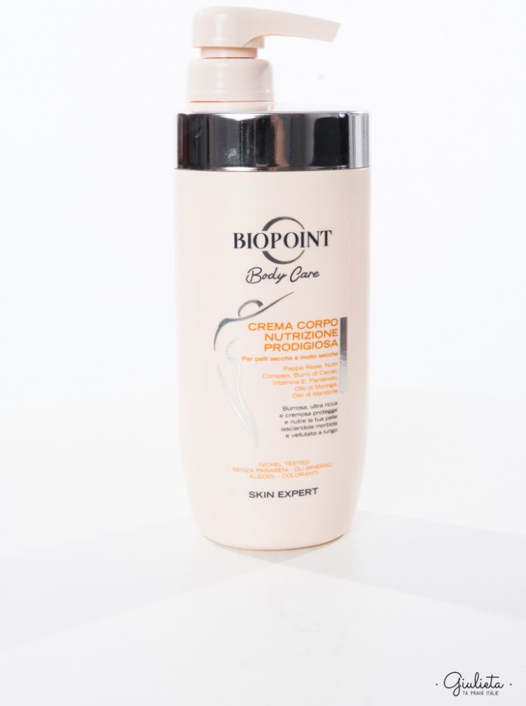 Výživný tělový krém na suchou a extra suchou pokožku Biopoint Crema Corpo Nutrizione Prodigiosa. Jeho smetanově máslové složení se snadno roztírá a okamžitě absorbuje. Ochraňuje a vyživuje pokožku a zanechává ji měkkou a sametově hebkou po dlouhou dobu, dodává jemnost a pružnost. Ultra bohatý na výživné látky, obsahuje mateří kašičku, Nutri komplex, kakaové máslo, Vitamín E, který má omlazující úč...