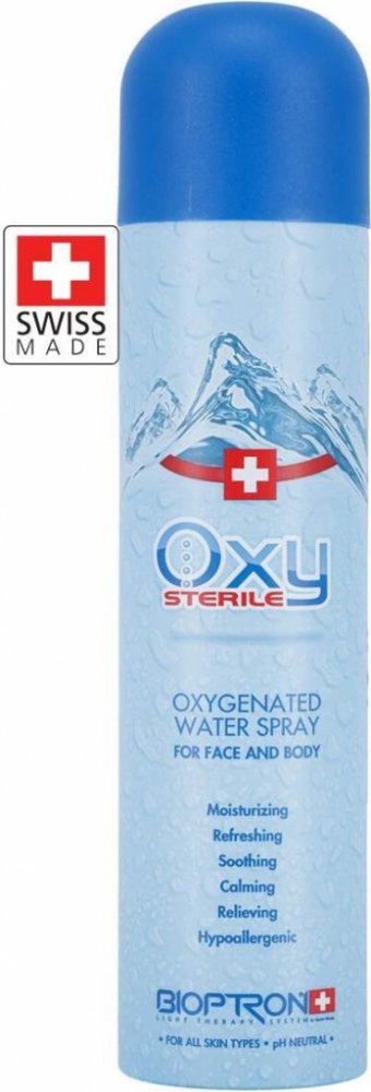 Sterilní Oxy sprej švýcarské výroby obsahuje zcela čistou vodu obohacenou kyslíkem pro hydrataci, osvěžení, úlevu a ochranu pokožky obličeje i těla.