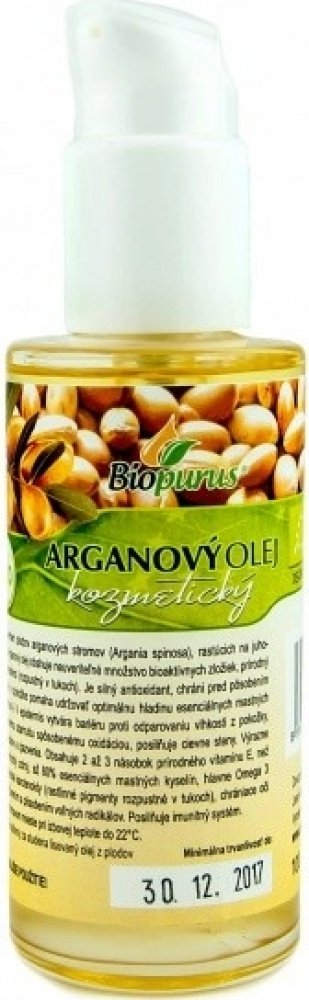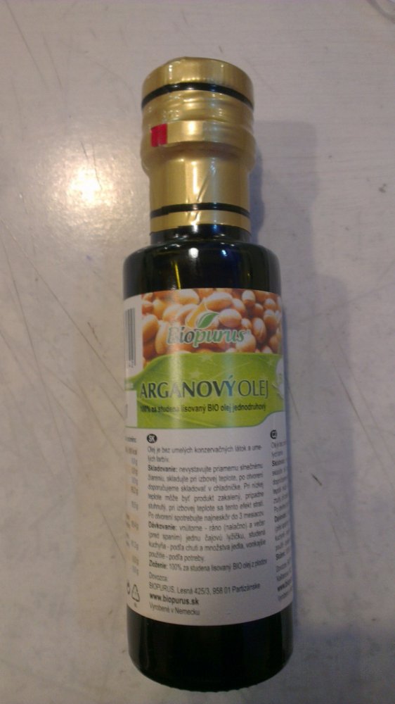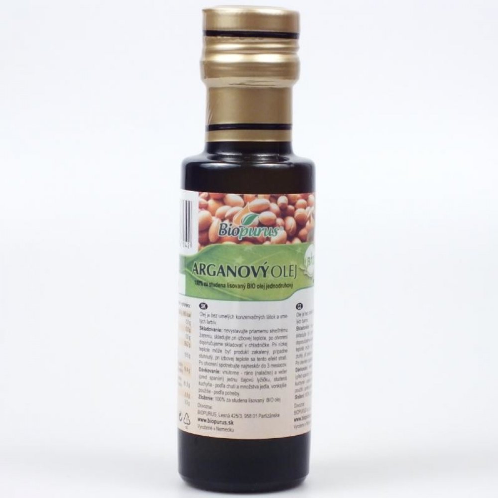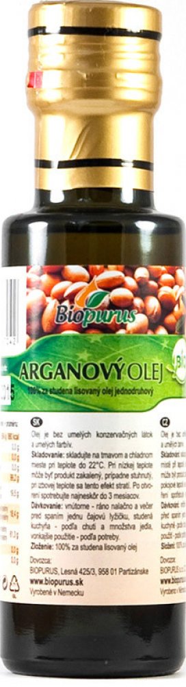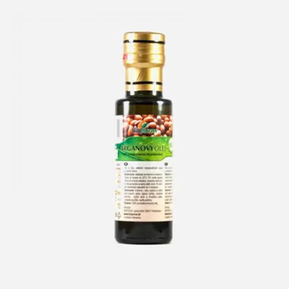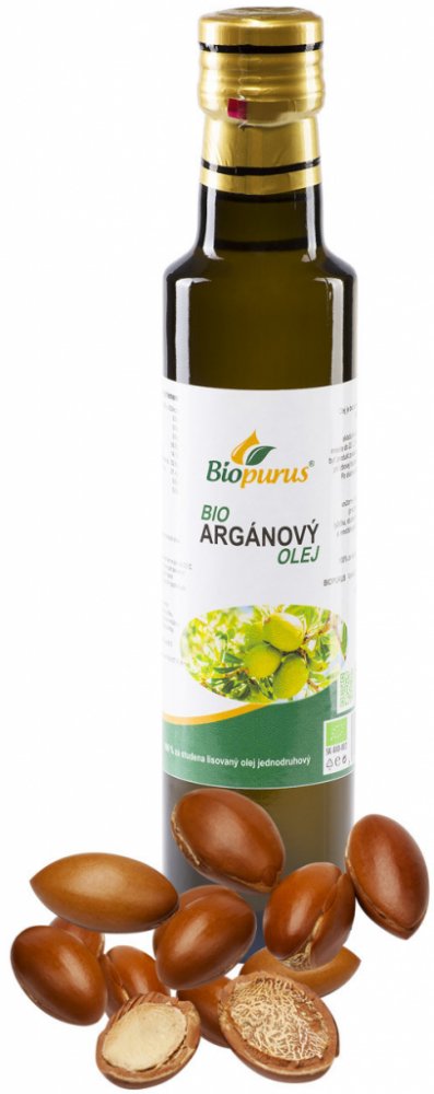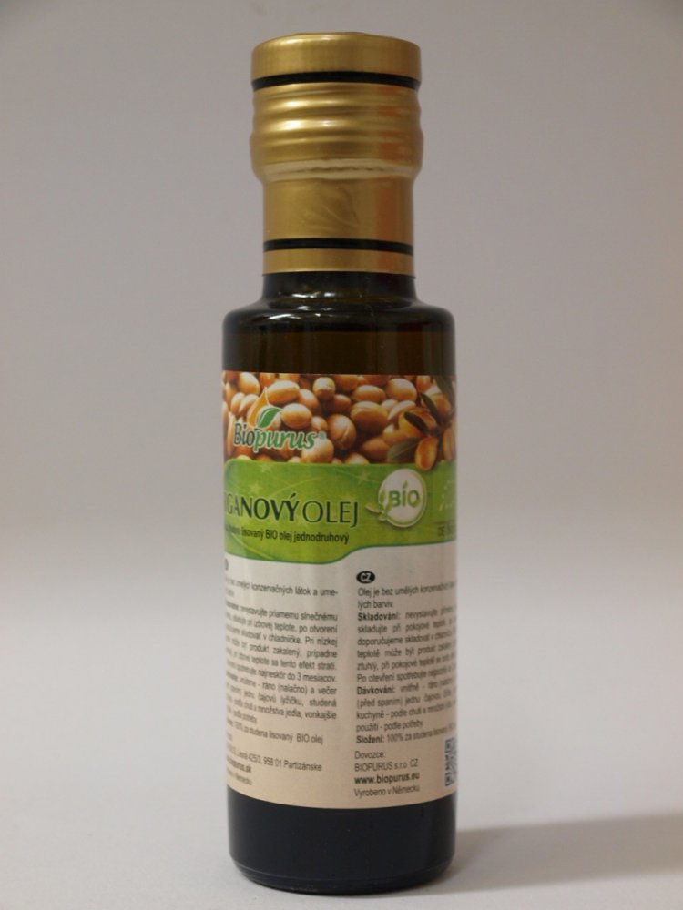 Arganový olej 100% za studena lisovaný olej. Plnohodnotný arganový olej se získává ze semen plodů arganového stromu (Argania spinosa), které rostou na jihozápadě Maroka. Sběr plodů a získávání oleje je velmi náročné, protože plody se sbírají ručně bez použití strojů a olej se lisuje ručně tradičním způsobem za studena. Na výrobu 1 litru čistého oleje potřebujeme až 30 kg plodů a lisování trvá asi 10 hodin. Z toho důvodu je arganový olej několikanásobně dražší než nejkvalitnější panenský olivový olej. Arganový olej je skutečný nektar, který obsahuje neuvěřitelné množství bioaktivních složek.