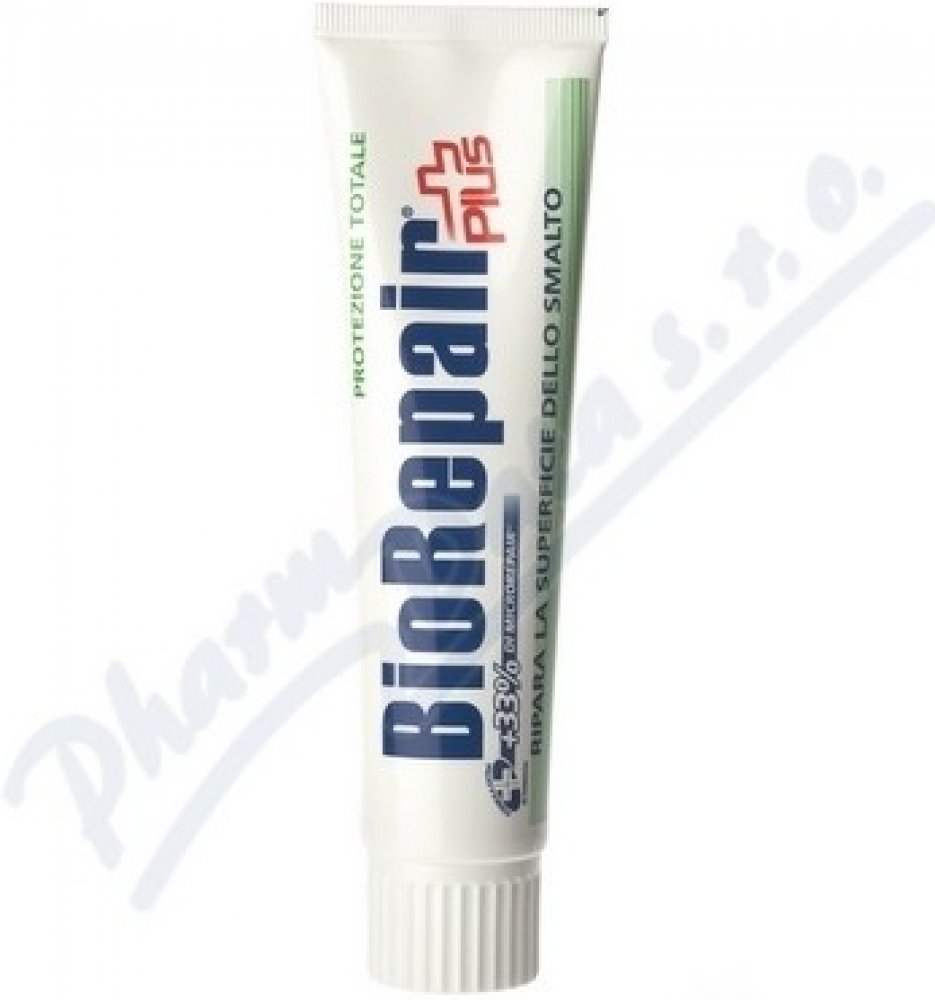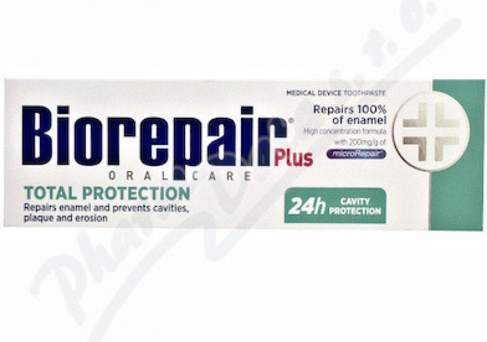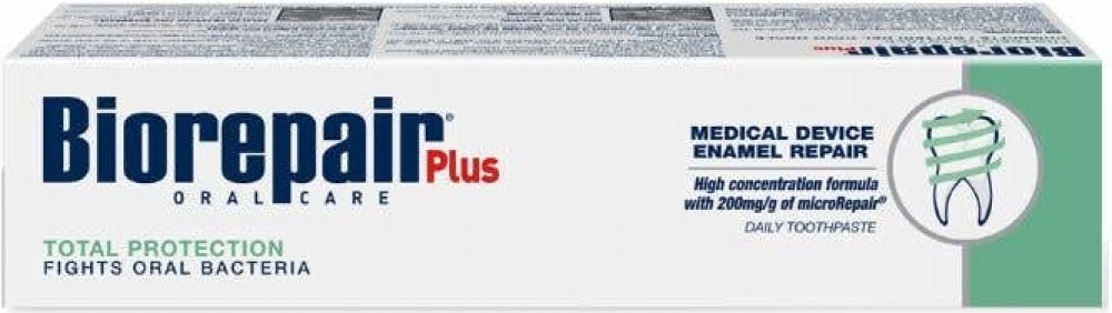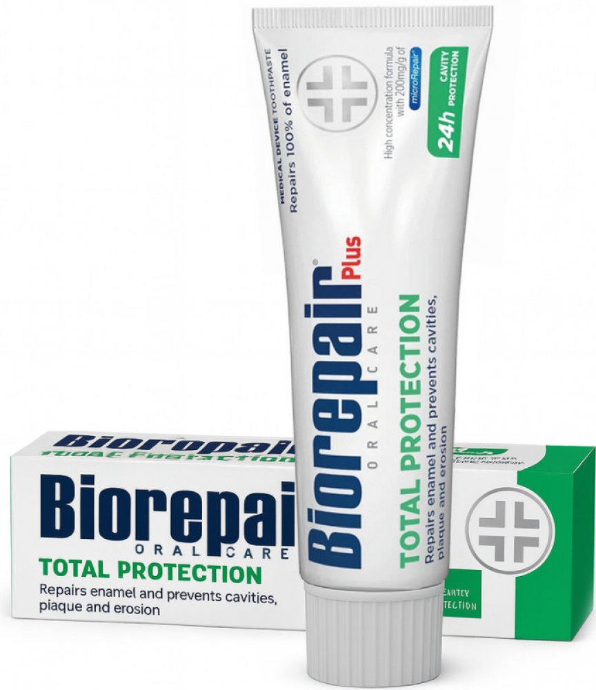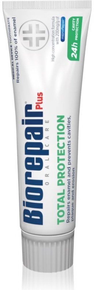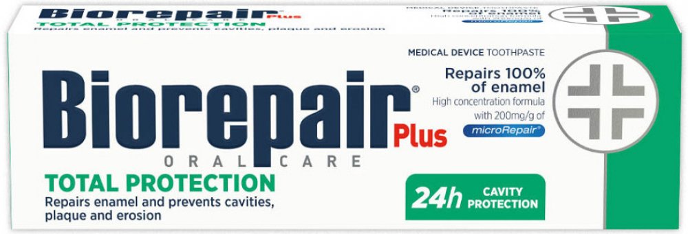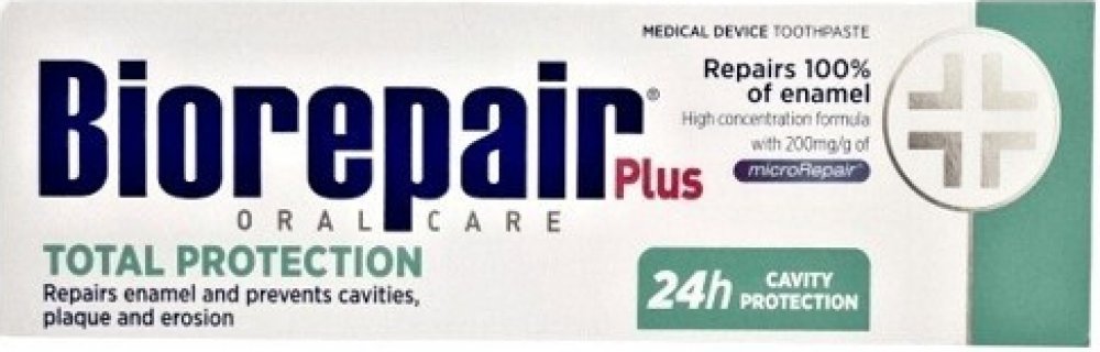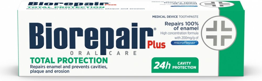 Zubní pasta BioRepair Plus Total Protection neobsahuje fluoridy, a přesto chrání zuby před zubním kazem a je vhodná pro každodenní používání. Komplexní ochranu zajišťuje patentovaná formule MircoRepair, která remineralizuje zubní sklovinu a působí antibakteriálně a preventivně proti vzniku zubního plaku, zubního kazu a kamene.