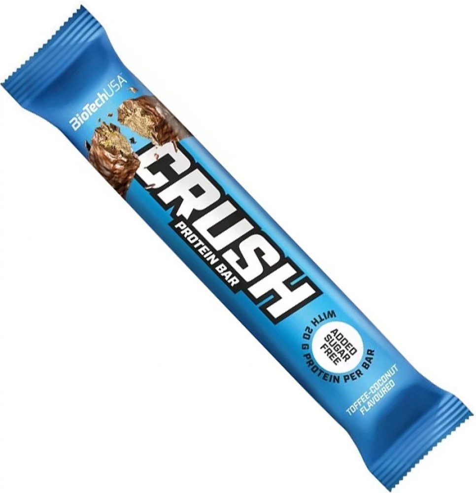 Karamel-kokos: poleva z mléčné čokolády se sladidlem 31 % [sladidlo (maltitol), kakaové máslo, sušené plnotučné mléko, kakaová hmota, emulgátor: lecitiny (sója), přírodní aroma], vrstva s karamelovou příchutí 18 % [plnidlo (polydextróza), kondenzované mléko, kakao máslo, zvlhčovadlo (sorbitoly), emulgátor (mono- a diglyceridy mastných kyselin), přírodní aroma, voda, sůl, barvivo (karamel)], mléčný protein, kolagenový hydrolyzát, extrudovaná sója 8,6 % (sójový proteinový izolát, rýžová mouka, extrakt z ječného sladu, sůl), zvlhčovadlo (glycerol), voda, kokosový olej, sójový proteinový izolát, strouhaný kokos 1,1 %, aroma, sůl, plnidlo (celulózový gel), slunečnicový olej, sladidlo (sukralóza). Může obsahovat stopy ořechů, vajec a arašídů.
