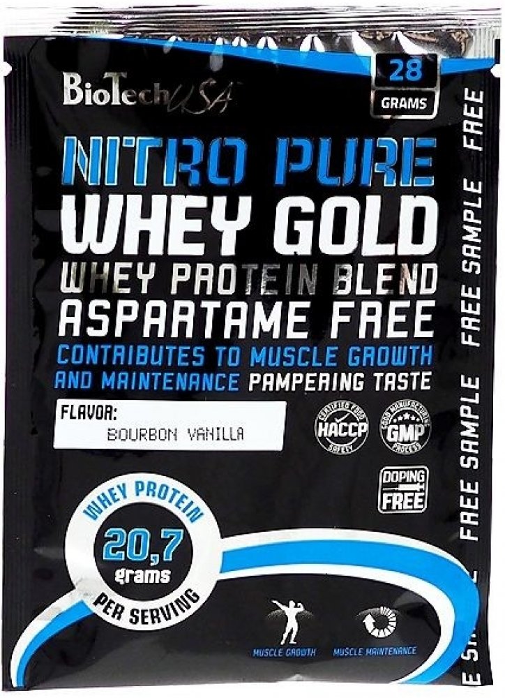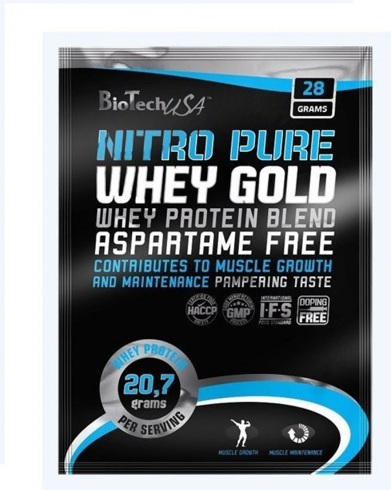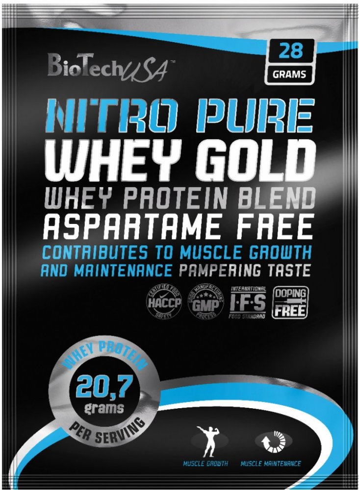 NITRO GOLD stanovil novú úroveň požiadaviek na kvalitné a dostupné prípravky zo srvátkovej bielkoviny. Nech je reč o tréningu, zameranom na zväčšenie svalovej hmoty, alebo o znižovaní telesného tuku, NITRO GOLD zabezpečí výborný a kompletný zdroj srvátkového proteínu. Každá dávka obsahuje 23 g proteínu, ktorý sa skladá podľa nášho vlastného patentu z čistej zmesi srvátkovej bielkoviny – je to jedinečná mixtúra, jej komponenty sú: ultrafiltrovaný srvátkový izolát, srvátkový koncentrát a glutamín. Vo svojej kategórii žiadny iný doplnok nemôže súperiť s formulou NITRO GOLD. Čistý srvátkový proteín sa vyrába bez prídavných látok a nízkym obsahom uhlohydrátov. NITRO GOLD neobsahuje srvátkové proteíny s iontovou výmenou, ktoré boli zbavené takých dôležitých komponentov, akými sú glykomakropeptidy, imunoglobulíny a laktoferrin. Počas výroby používame najvyspelejšiu technológiu. NITRO GOLD je aj výborným zdrojom glutamínu. NITRO GOLD je chudobný na tuky a uhľohydráty. Z tejto formuly vynikajúcej chuti si môžeme kedykoľvek pripraviť osviežujúci proteínový nápoj. Výskumy dokázali, že intenzívne trénujúci športovci potrebujú viac bielkovín. Odborníci z oblasti vedy o výžive a profesionálni športovci doporučujú prísun o niečo viac ako 2 g proteínov na 1 kg telesnej hmotnosti denne. Napríklad človek s telesnou hmotnosťou 90 kg, by mal denne prijímať aspoň 200 g proteínov.
